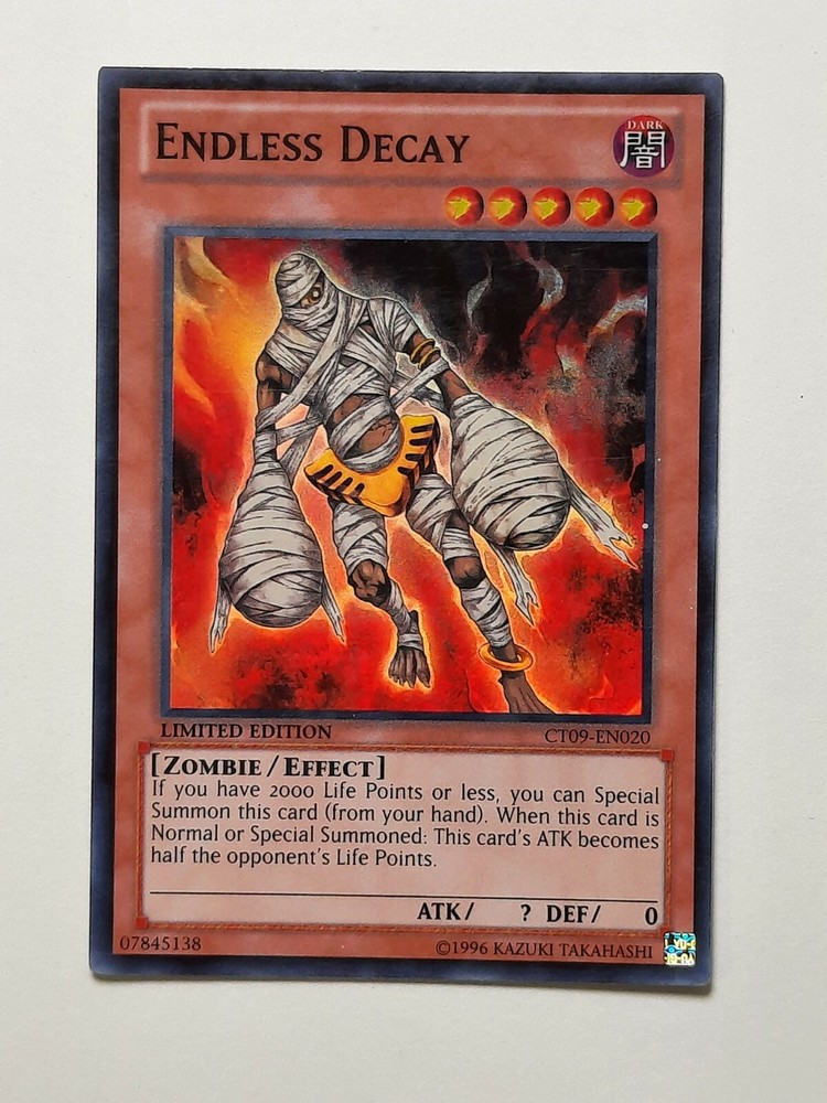 Yu-Gi-Oh! Card - Endless Decay Card is in NEAR MINT Condition. See Photos for more detail. CT09-EN020 SUPER RARE LIMITED EDITION! Every card is packed in a sleeve and a hard top loader case. Thanks fo...