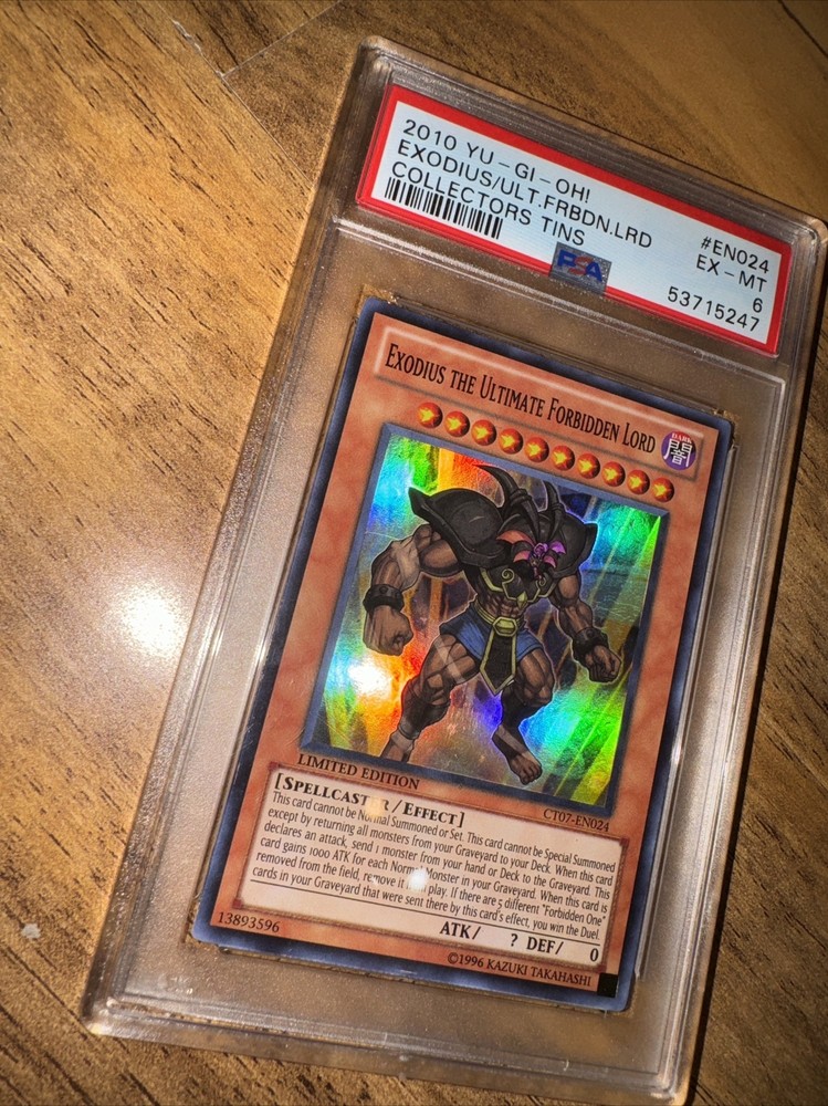 This Yugioh Exodius The Ultimate Forbidden Lord CT07-EN024 card is a must-have for collectors of the popular trading card game. Featured in the 2010 Collectors Tins, this card is graded by Professional Sports Authenticator (PSA) and has received a grade of 6. It is manufactured by Konami and has the card number CT07-EN024. This card is perfect for fans of the game who are looking to add a rare and valuable card to their collection. It features Exodius the Ultimate Forbidden Lord and is sure to impress any serious collector. Bid with confidence on this amazing card!