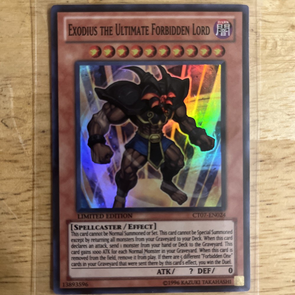 Exodius the Ultimate Forbidden Lord. This Super Rare card features a Dark attribute, belongs to the Spellcaster creature type, and has a holo finish. Part of the 2010 Collectors Tins set, this Effect card is in near mint condition with no visible scratches or signs of play.