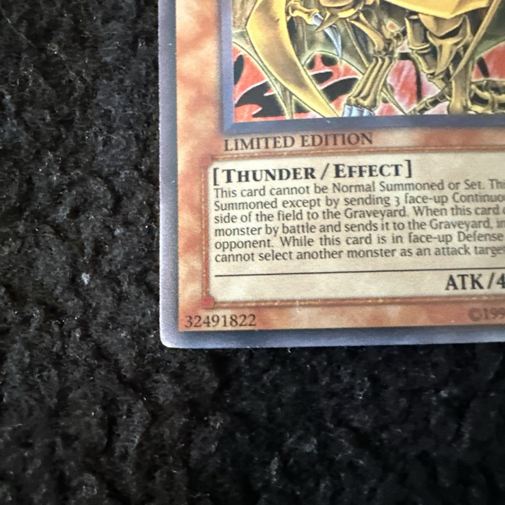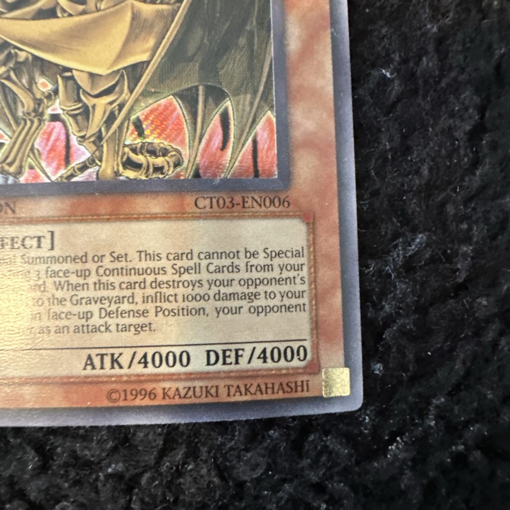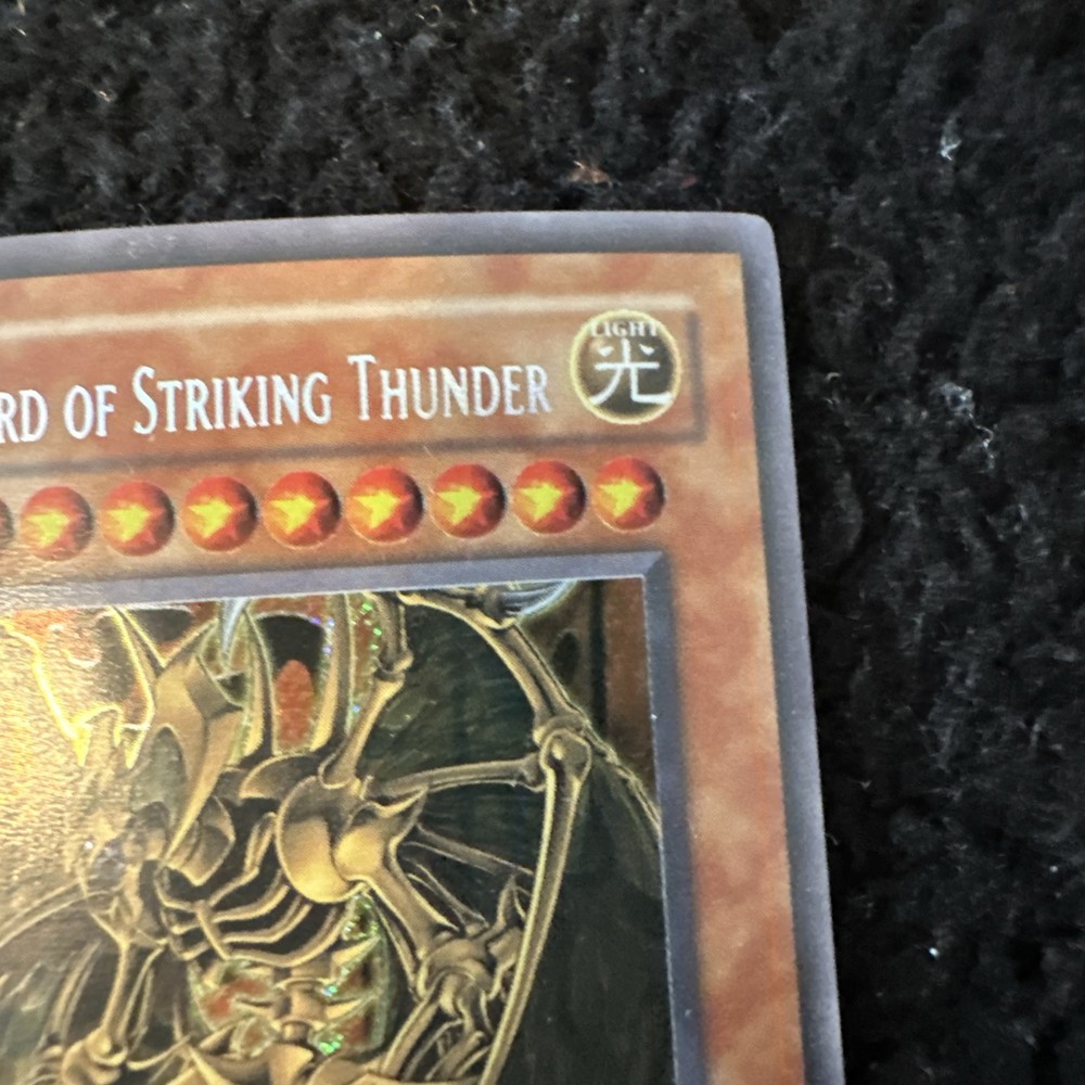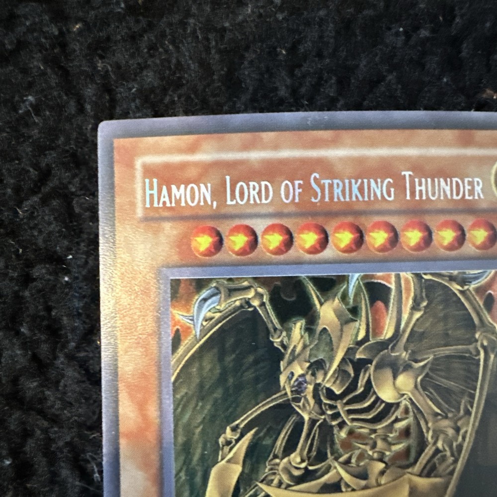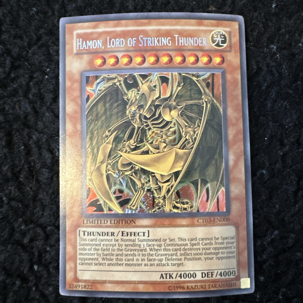 Yugioh Hamon, Lord of Striking Thunder CT03-EN006 is a Secret Rare Limited Edition card from the 2006 Collector's Tins set. This English card features the Thunder Monster Type and is an Effect card with a Holo finish. It is manufactured by Konami and is in lightly played (Excellent) condition.