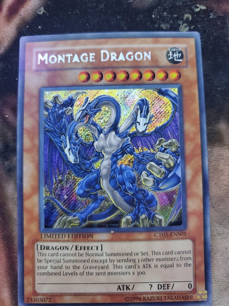 Here is a yugioh card montage dragon that appears to be double stamped of some sort. Looks different compared to the title of other same montage dragon cards. Card name looks much thicker...