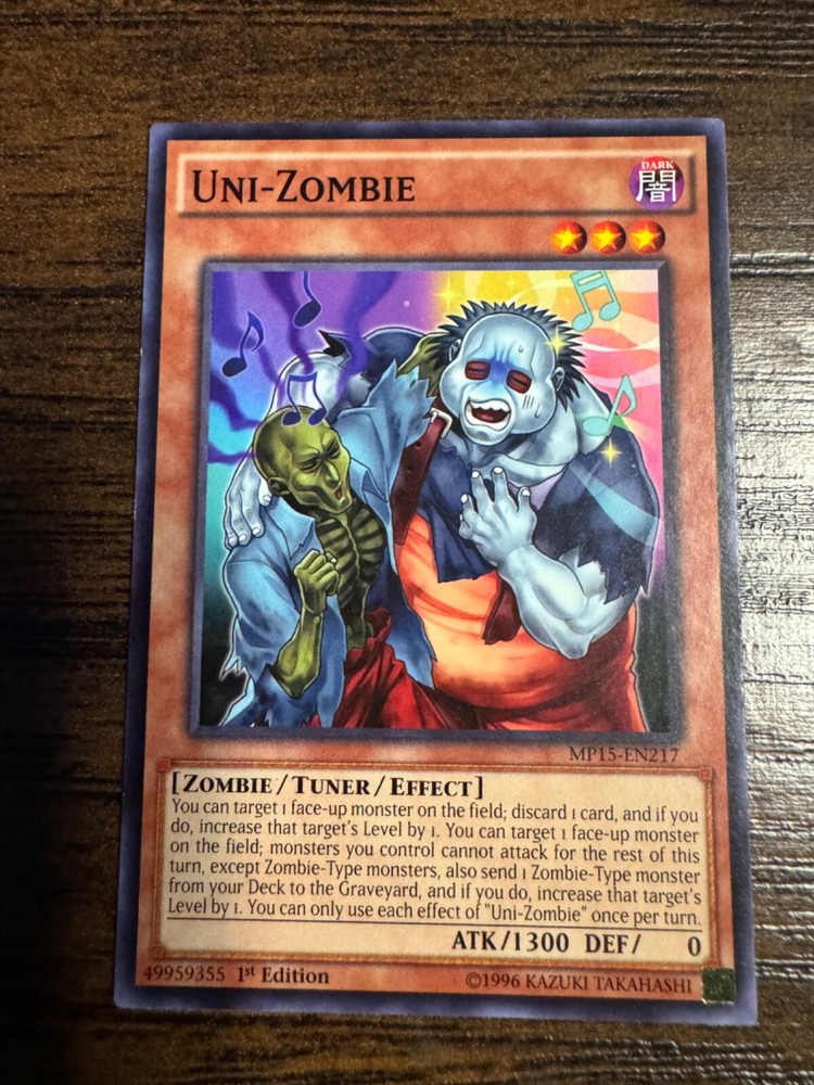 This Yugioh! card features the Uni-Zombie effect and is a lightly played, 1st edition card from the 2015 Mega Tins set. It is a common card and has a light attribute in the Color category. The card is in English and is perfect for collectors of CCG individual cards or those who enjoy the Yu-Gi-Oh! TCG game.