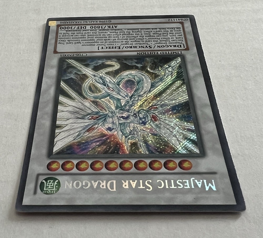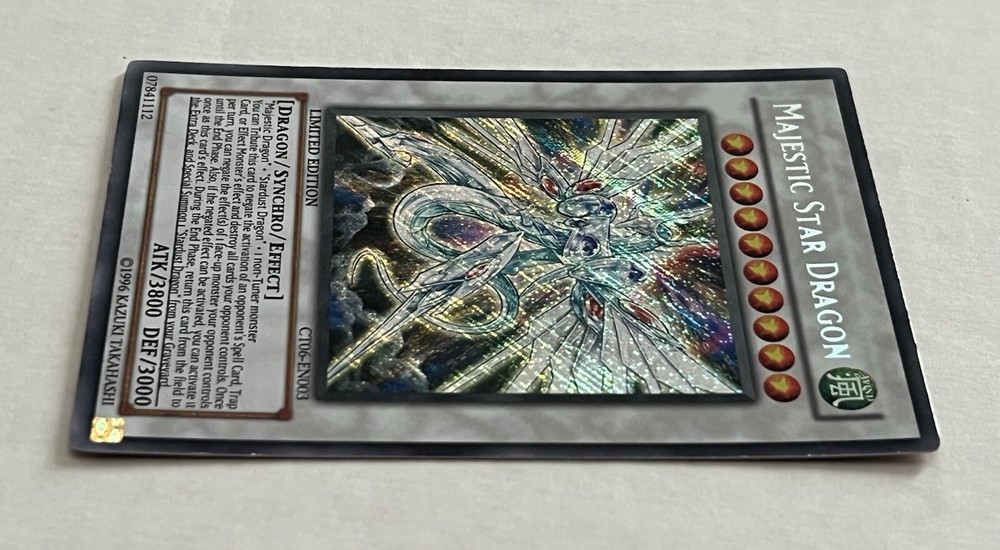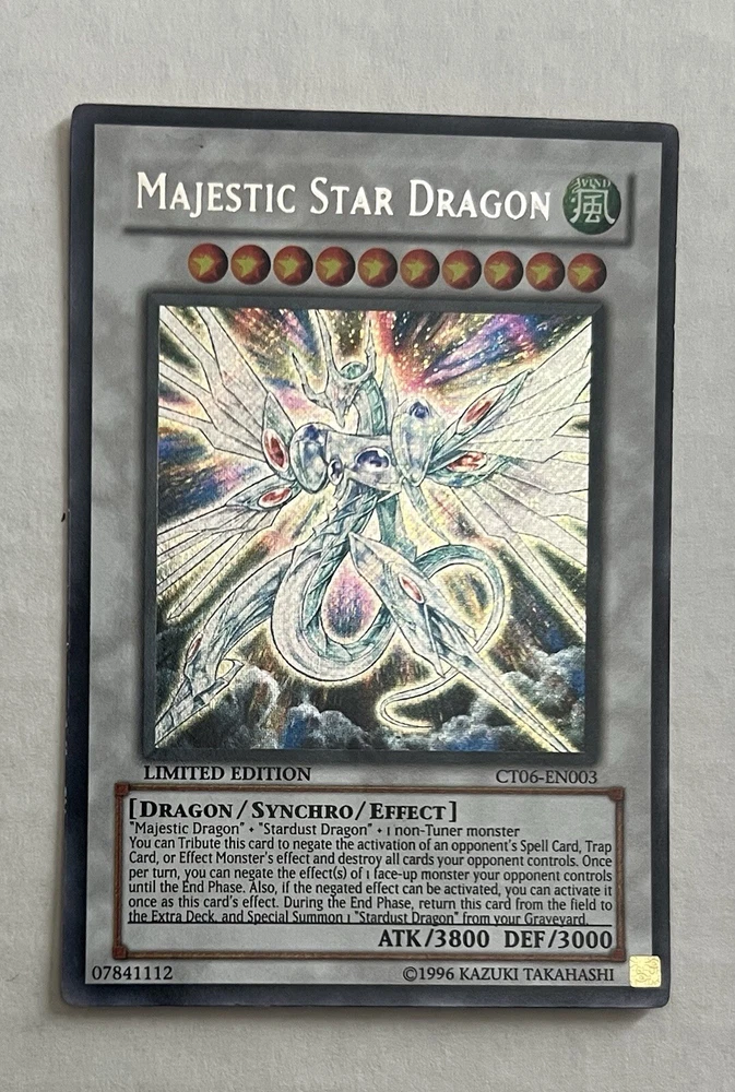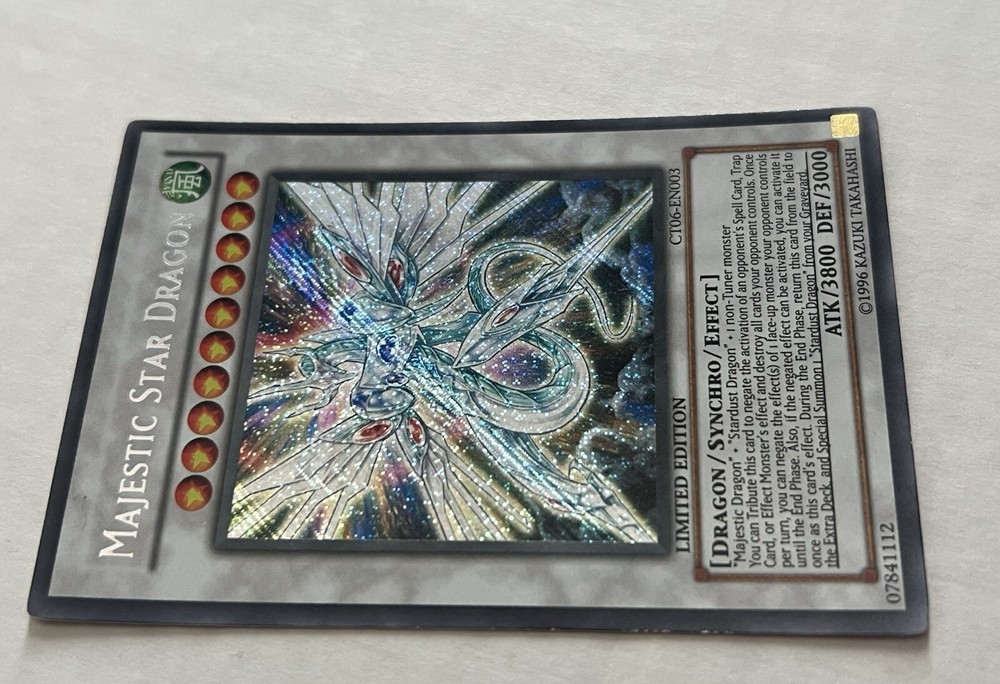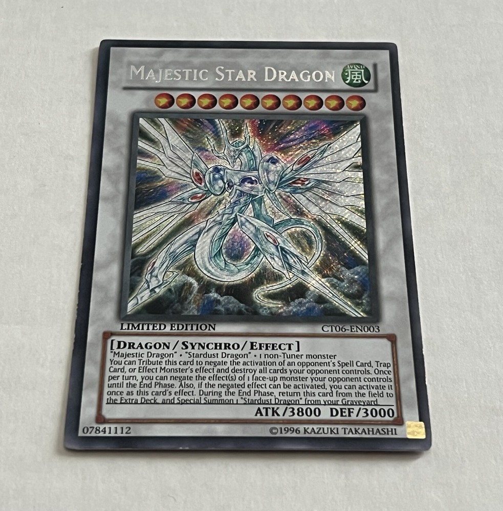 Yugioh MAJESTIC STAR DRAGON Secret Rare CT06-EN003 Limited Edition VLP. Card is in beautiful condition with very little sign of wear. Please see all photos as this is the exact card you will receive. Will ship in a sleeve, inside of a top loader, using eBay standard envelope shipping.