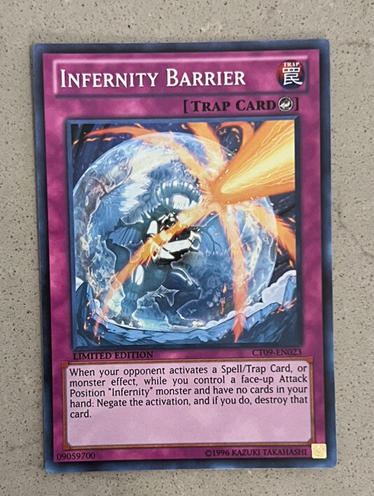This limited edition Yu-Gi-Oh! card, Infernity Barrier, from the 2012 Collectors Tins set, is a must-have for any fan of the game. Its rarity as a super rare card makes it even more special and highly sought after by collectors. The card's features, including being a limited edition and its unique card name, add to its value and desirability. This card is perfect for those looking to enhance their Yu-Gi-Oh! collection or for those who simply want to add a rare and valuable piece to their card game arsenal.