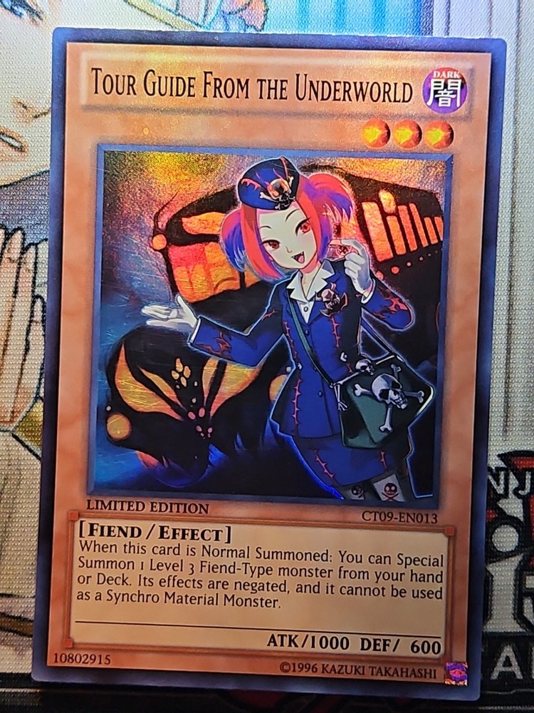 You are bidding on: Yugioh! Tour Guide From the Underworld - CT09-EN013 - Super Rare - Limited Edition Condition: Condition: Moderately Played | Language: English All photos are stock, unless mentioned otherwise. Card edition, rarity, etc. are listed in the title and description. Cards are in English unless otherwise stated in title or description. Items will be shipped within 1 business day upon receiving cleared payment. We ship Monday through Saturday in order to get the item(s) to you as quickly as possible Before leaving neutral or negative feedback, please contact us beforehand so we can discuss the issue. Feel free to message me with any questions you have regarding this auction or my policies. Shipping Options: USPS Mail - $0.99 Orders $29.99 (exc. sales tax) and under will be sent in a white envelope in a card saver + soft sleeve using eBay's Standard Envelope tracking service. Orders $30.00 (exc. sales tax) and over will be sent with free USPS tracking information w/ toploader + soft sleeve. Priority Mail - $9.99 2-3 Day shipping Orders will be shipped in a flat rate envelope in a toploader + soft sleeve. Priority Express Mail - $29.99 1-2 Day shipping Orders will be shipped in a flate rate envelope in a toploader + soft sleeve. *All orders over $100 will be sent with free insurance. All orders over $250 will be sent with free insurance and signature confirmation.* Card Grading: Near Mint (NM) - Cards with this grade will show minimal to no wear from shuffling, play or handling and can have a nearly unmarked surface, crisp corners and unblemished edges outside of a few minimal flaws. Holographic cards are more scrutinized than non-holo cards. Lightly Played (LP) - Cards with this grade may have a few dings, light playwear and/or edgewear. A crease or bend is acceptable if it is less than approximately 1/2 inch in size and is only visible on one side. Moderately Played (MP) - Cards with this grade may have dings, playwear and/or edgwear, 1 or 2 creases or bends that do not go through the length of the card. Heavily Played (HP) - Cards with this grade may have dings, playwear and/or edgwear, creases or bends that may go the length of the card, markings and/or coloring, tears on the edges. Despite being the lowest of grading, these cards are still tournament legal. If you receive a card not in the stated condition, please contact us to return the item for a full refund. Thank you for buying.