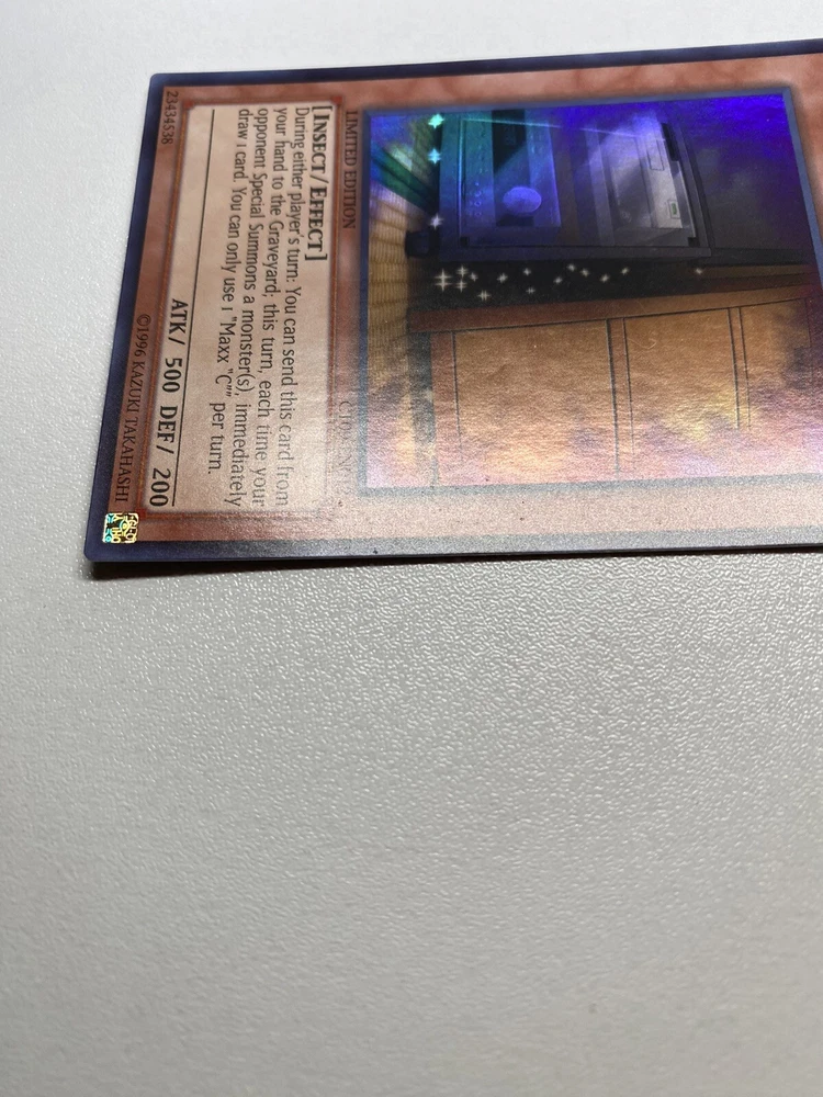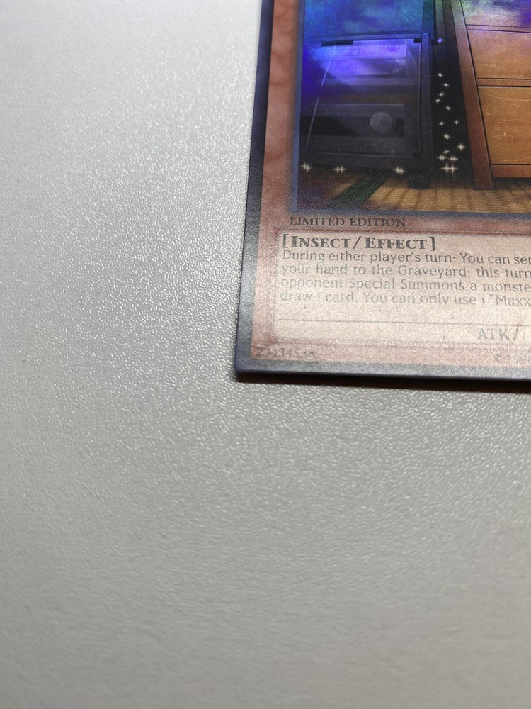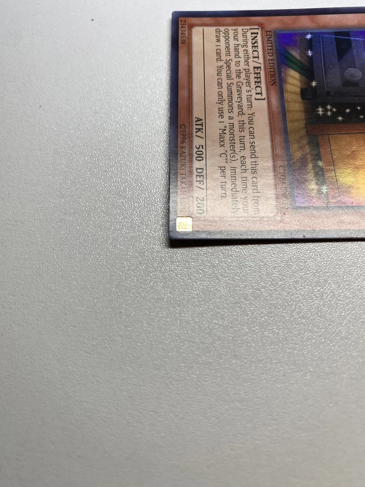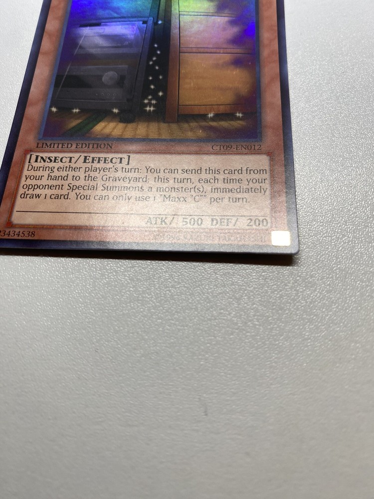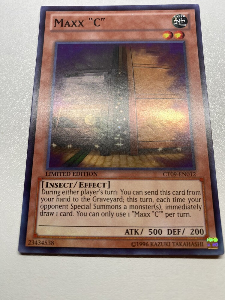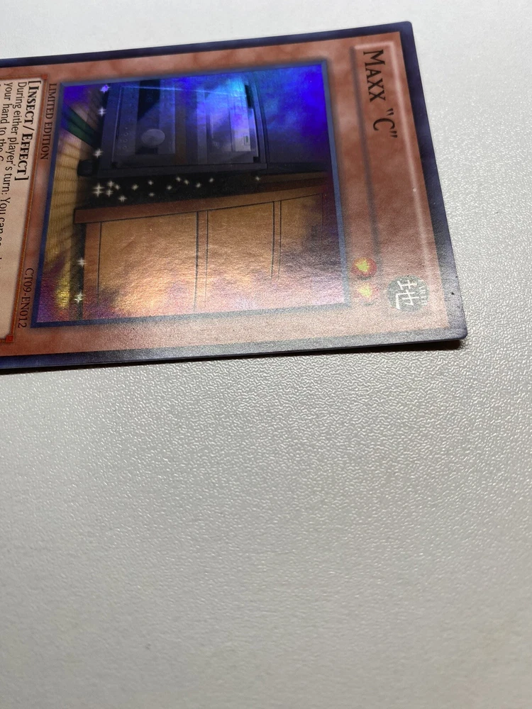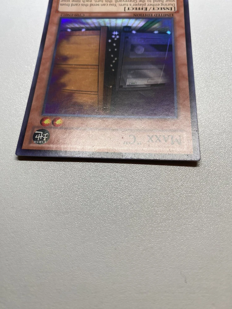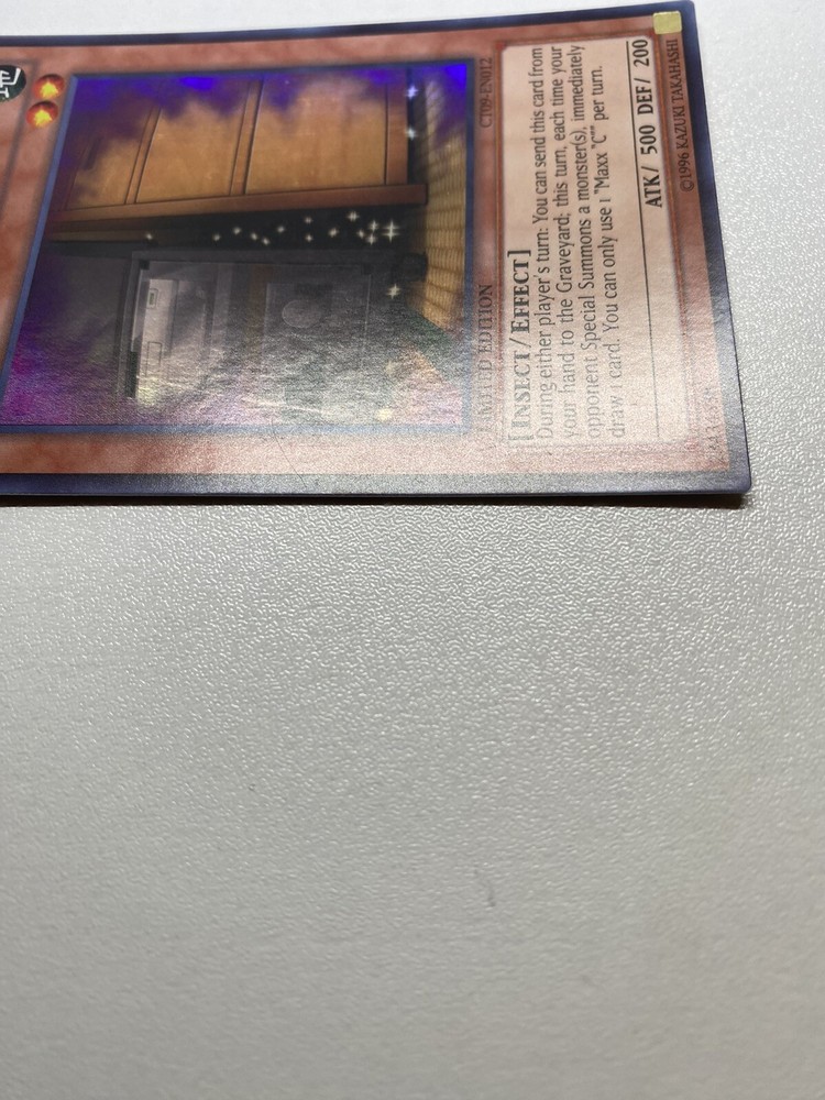 Yugioh Maxx C Limited Edition Super Rare CT09-EN012 HP It is heavily played. Check pictures to see details on condition of the card. The front and back of the card are very dirty from gameplay. The front and the back are very scratched from gameplay. The four corners are very scratched up. There are several dent on the front foil part of the card and dents on the back also. “eBay International Shipping Program” and USA shipping only. No international shipping. I do combine/bundle shipping. I do use recycled shipping items to stay eco friendly for our beautiful earth. Please leave positive feedback, and I will return positive feedback for better customer satisfaction, thanks.