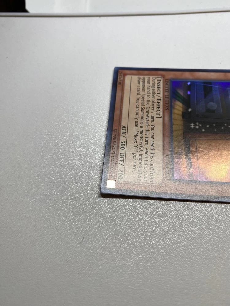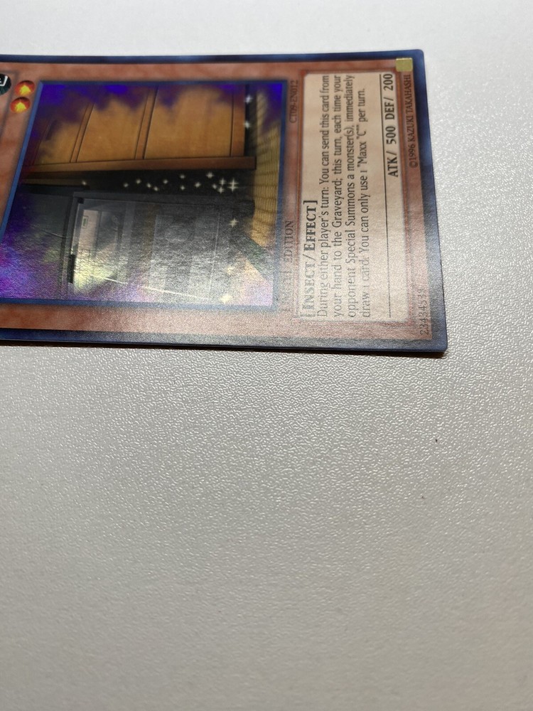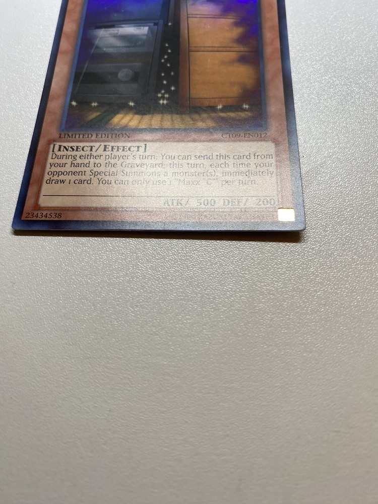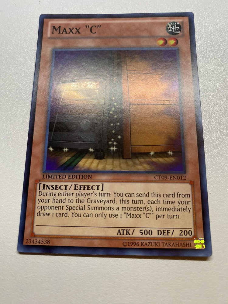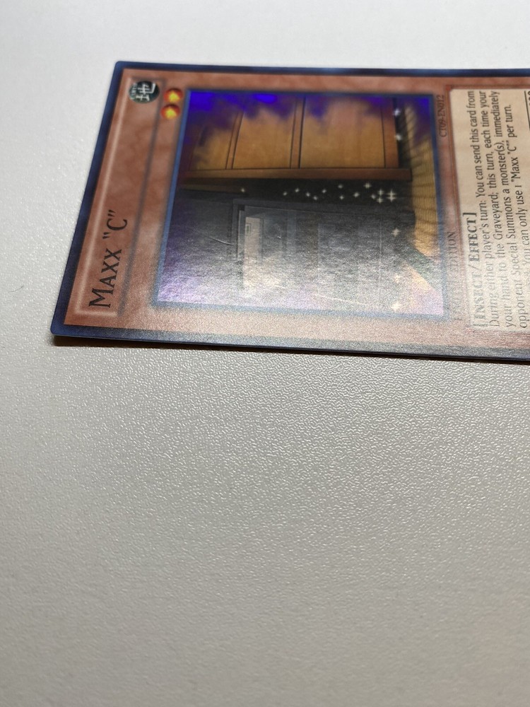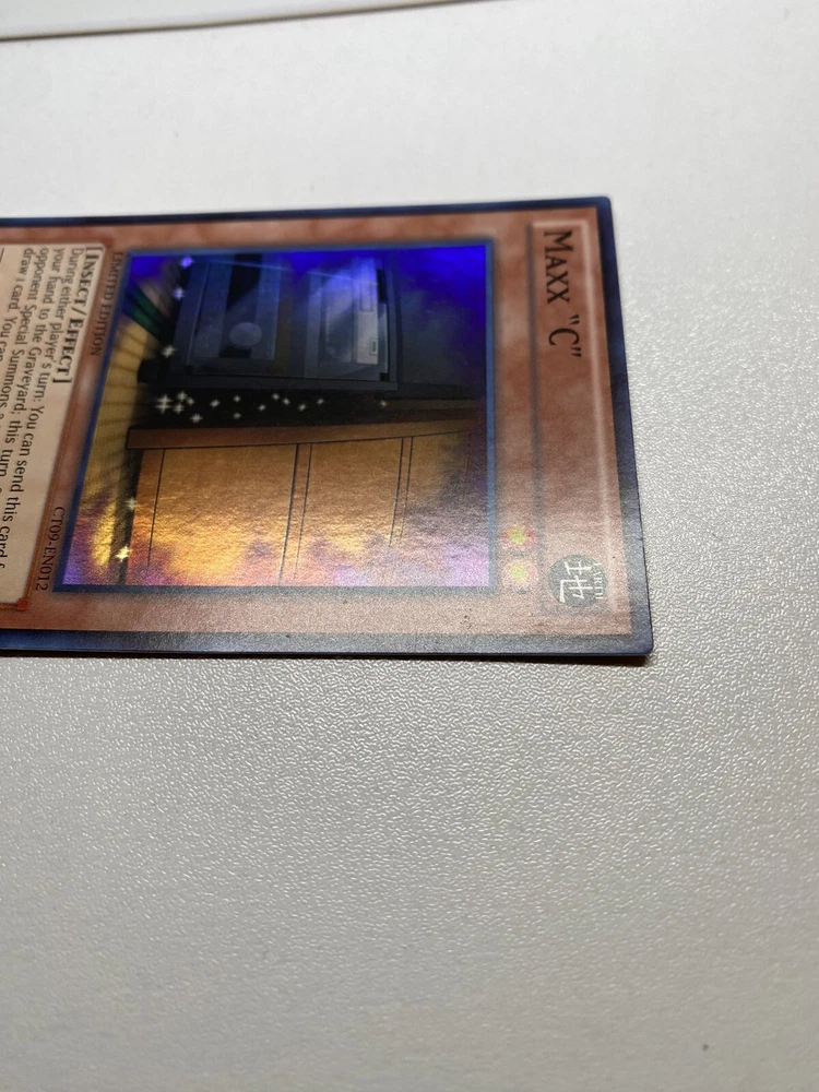 Yugioh Maxx C Limited Edition Super Rare CT09-EN012 MP It is moderately played. Check pictures to see details on condition of the card. The front and back of the card are dirty from gameplay. The front and the back are scratched from gameplay. The four corners are scratched up. There are several dents on the front foil part of the card and dents on the back also. “eBay International Shipping Program” and USA shipping only. No international shipping. I do combine/bundle shipping. I do use recycled shipping items to stay eco friendly for our beautiful earth. Please leave positive feedback, and I will return positive feedback for better customer satisfaction, thanks.