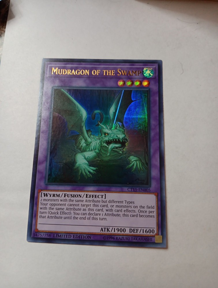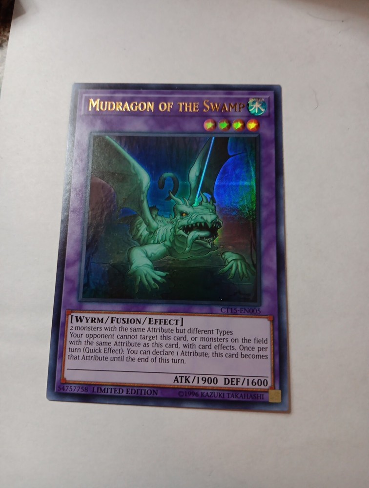 This limited edition ultra rare Mudragon of the Swamp card is a must-have for any Yu-Gi-Oh! TCG collector. With its stunning holo finish and water attribute, this card is sure to be a standout addition to your collection. The card is in standard size and comes from the collectors tin set, making it a unique and sought-after item. Featuring the creature type Wyrm and card number CT15-EN005, this effect card is manufactured by Konami and is in English language. Don't miss out on the opportunity to add this rare card to your collection.