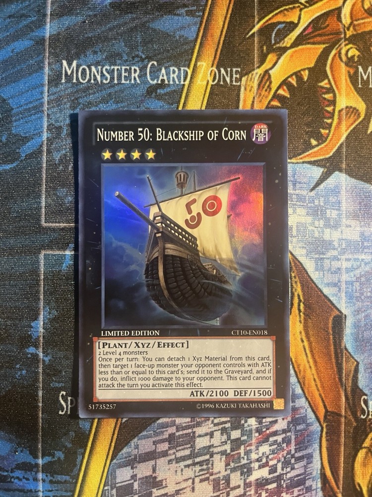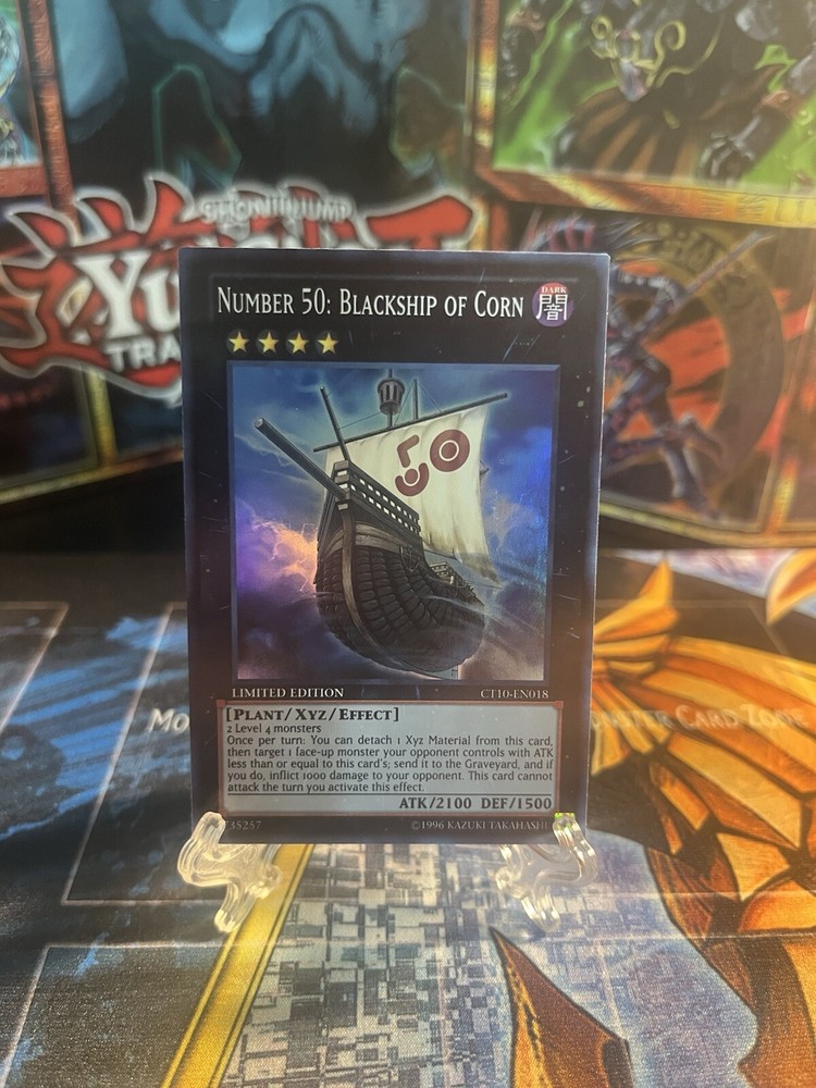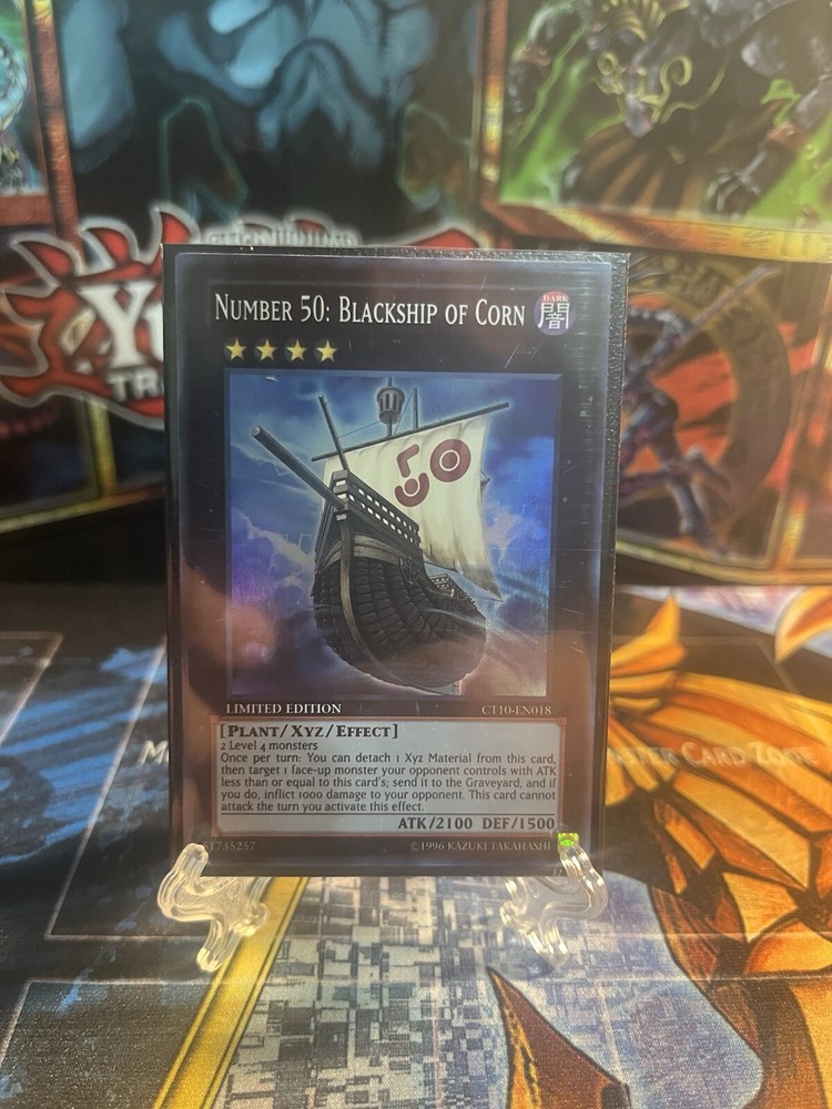 The product is a Yu-Gi-Oh! trading card called "Number 50: Blackship of Corn" from the 2013 Collectors Tins set. It is a Dark Plant-type monster card with a Super Rare rarity and Holo finish. Manufactured by Konami, this card is part of a limited edition release and does not have any autographs or grading. The card features the iconic Number 50 Blackship of Corn and is a highly sought-after collectible in the world of Yu-Gi-Oh! trading card games.