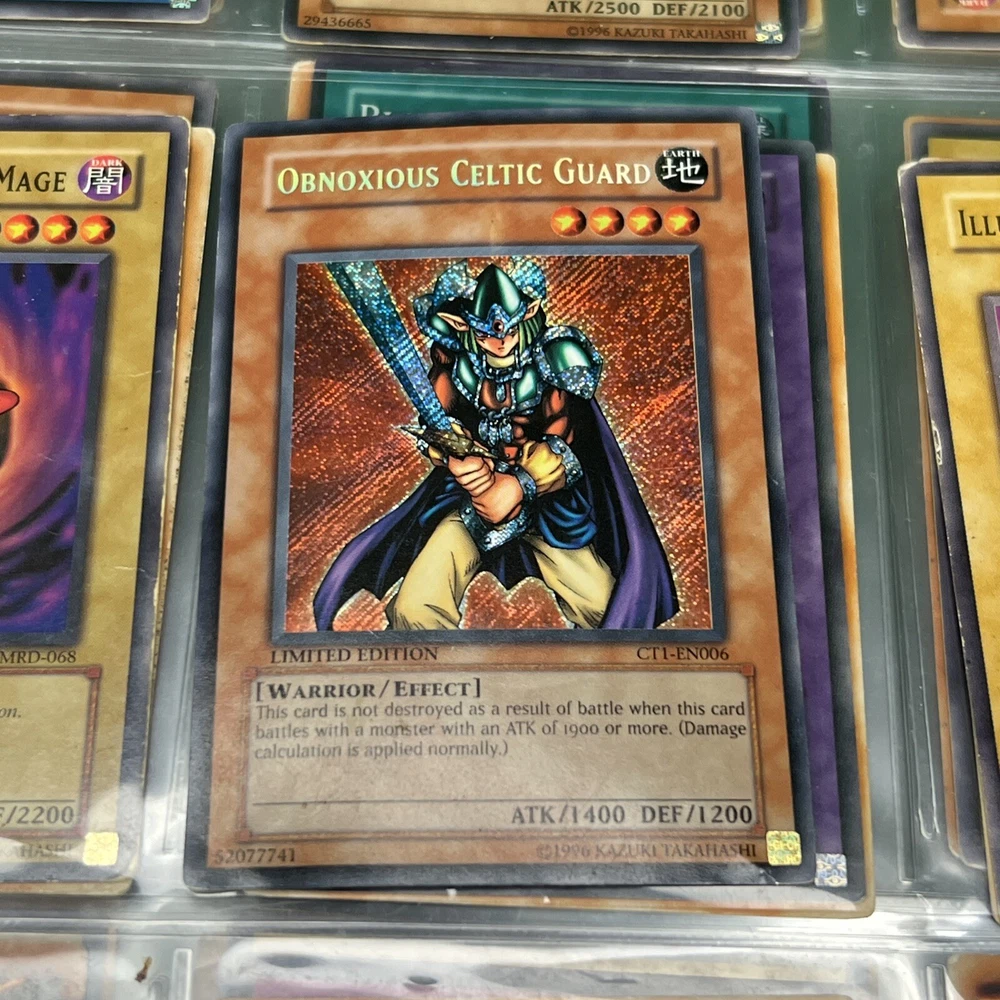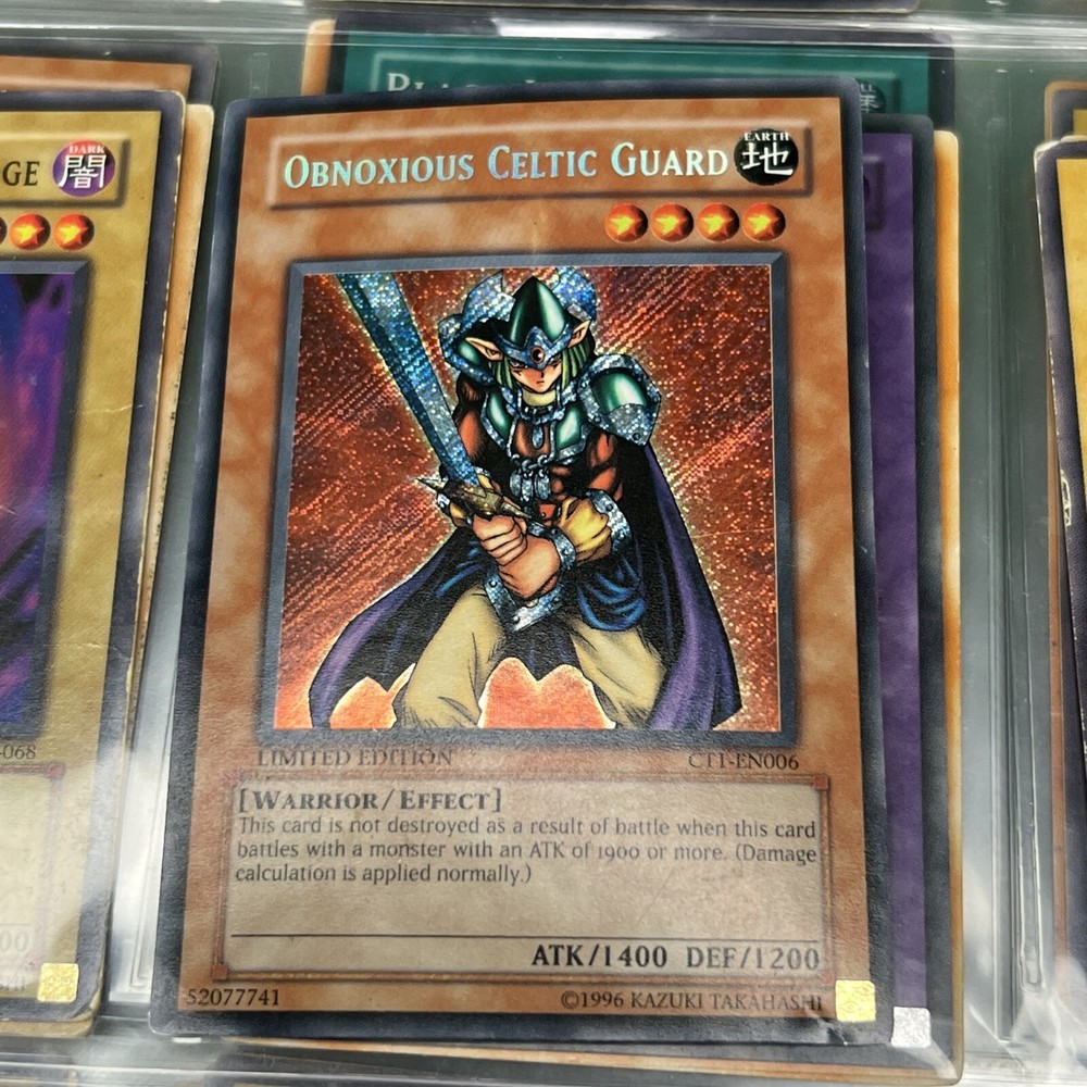 This limited edition Yugioh card features the Obnoxious Celtic Guard, a warrior type creature/monster. It is made of high-quality card stock material with a holographic finish, and is part of the 2004 Collector's Tin set. The card is in English language and has the card number CT1-EN006. The card is perfect for collectors and fans of the Yu-Gi-Oh! TCG game. It features Yami Yugi and Joey Wheeler characters, and is a vintage item manufactured by Konami in the United States. The card is not autographed and is made of Japanese card size. Get your hands on this rare and highly sought-after card today!