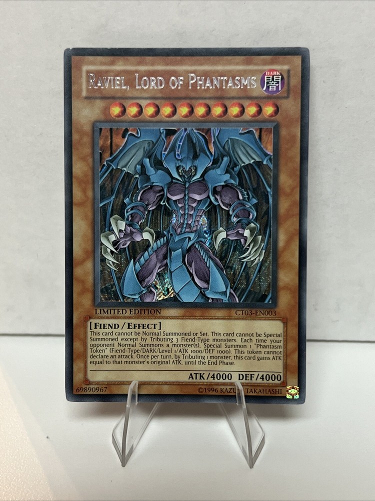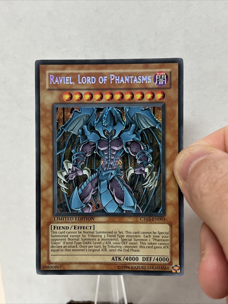 Elevate your Yu-Gi-Oh! TCG collection with the captivating Raviel, Lord of Phantasms card, a Secret Rare gem from the limited edition set CT03-EN003. Boasting a stunning holographic finish, this effect-type card is a must-have for both players and collectors alike, featuring the enigmatic Phantasm creature/monster type. Crafted by Konami, this card is not just a formidable addition to your gameplay but also a treasured piece for its collectible value. Whether you're looking to dominate the duels or to showcase a piece of Yu-Gi-Oh! history, Raviel, Lord of Phantasms is an exceptional find.