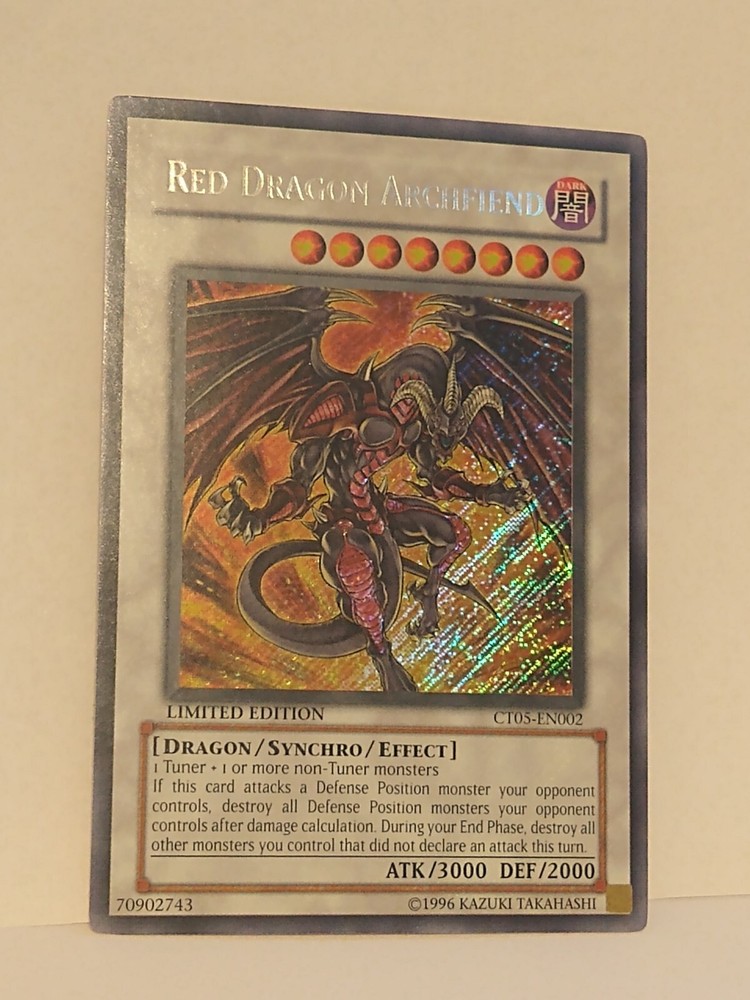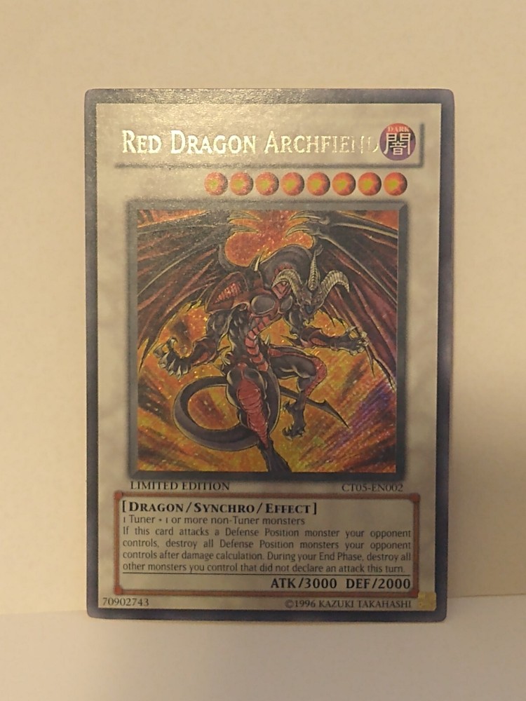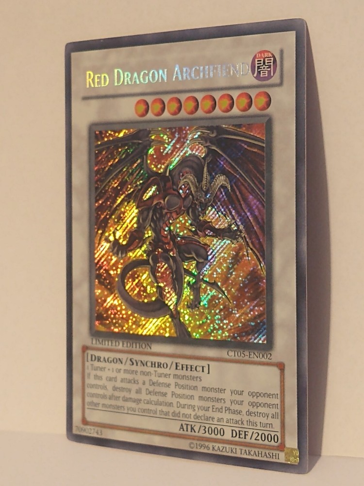 This limited edition Red Dragon Archfiend card is a must-have for any Yu-Gi-Oh! collector. With its dark color, foil finish, and secret rare rarity, this card is sure to be a standout addition to your collection. The card features the iconic Red Dragon Archfiend character and is part of the 2008 Collectors Tin set. This card is perfect for players and collectors alike, and is suitable for anyone ages 6 and up. It is a Synchro card type and has the card number CT05-EN002. The card is manufactured by Konami and is part of the Yu-Gi-Oh! TCG game. Don't miss out on the chance to add this rare and sought-after card to your collection. Well centered, always sleeved.