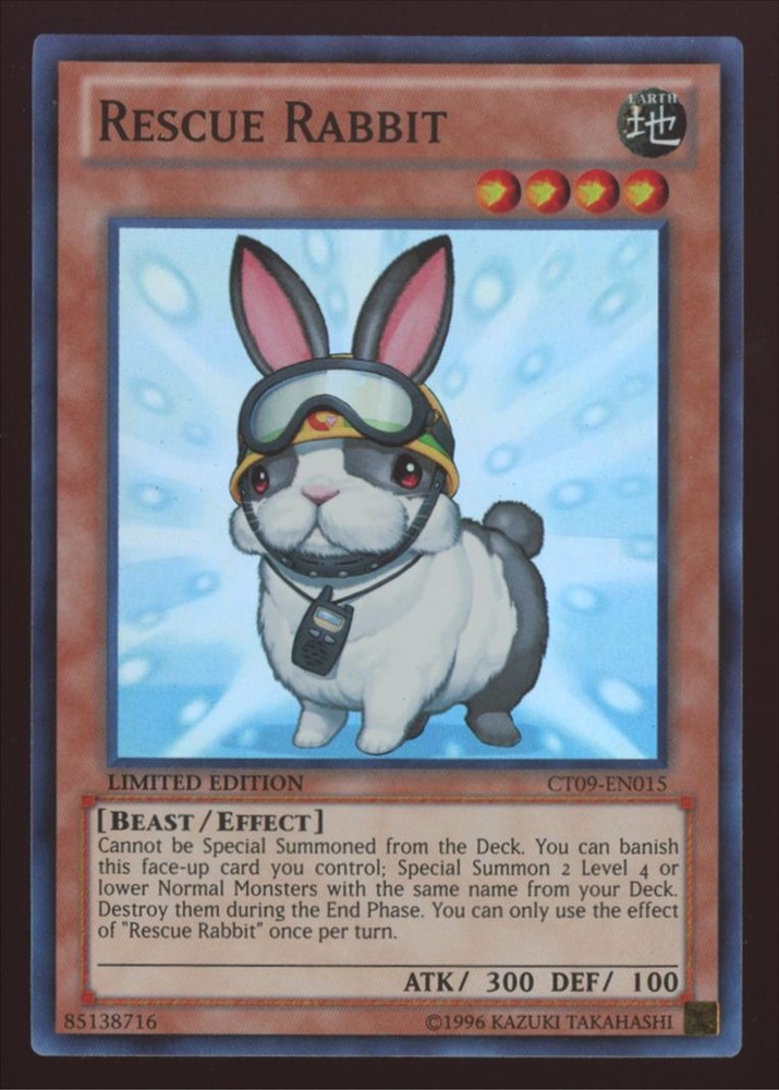 You are bidding on the following card(s): Collectible Tins 2012 #CTO9-EN015 Rescue Rabbit The card(s) included in this listing have the following attributes (if applicable): Limited Rare All cards are shipped with the utmost care! We ship the majority of our cards (any that sell for under $20) via eBay's standard envelope method. While using this method, we take the necessary precautions to ensure that your card(s) get to you safely! Sadly, per eBay's shipping policies for TCG lots, we are required to ship via first class. If you have any questions concerning combined shipping (or anything else), please feel free to reach out directly to us!