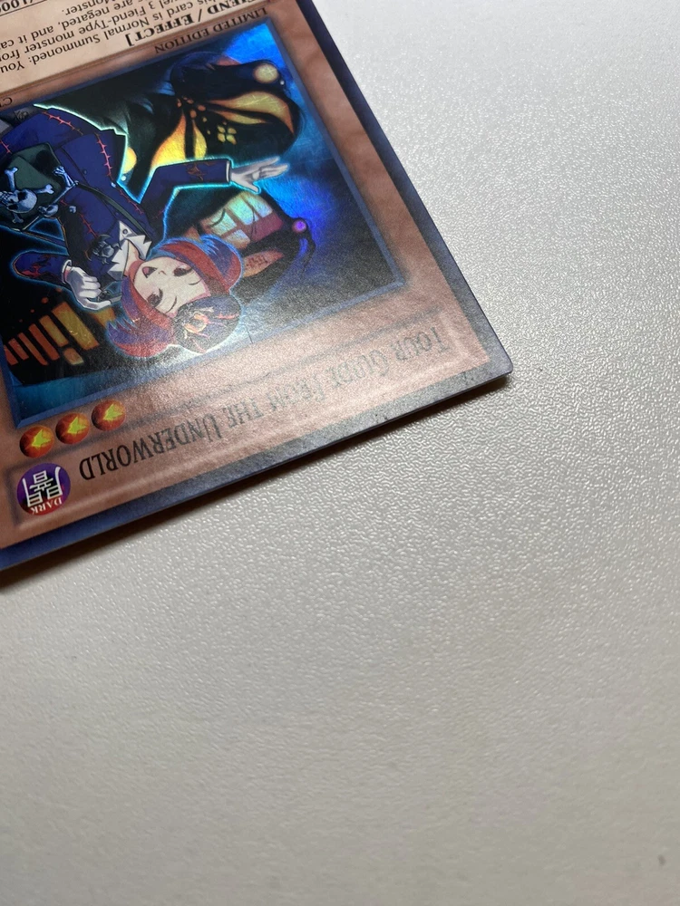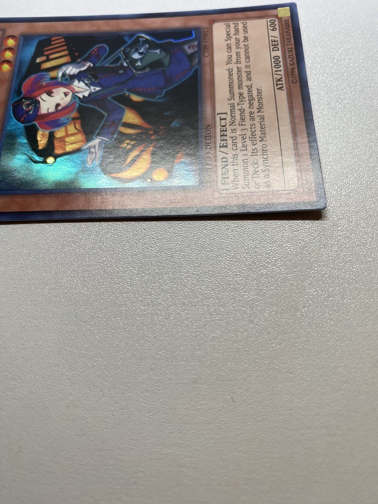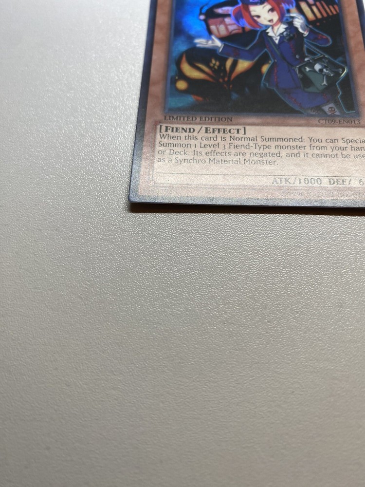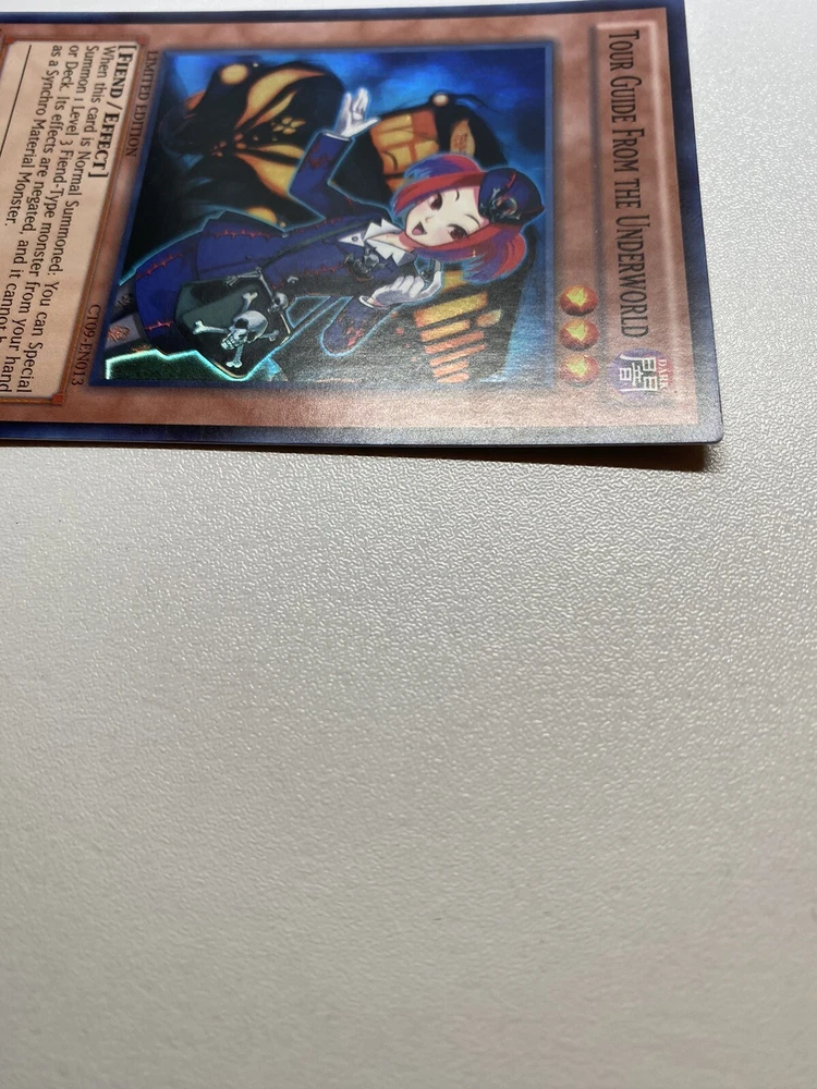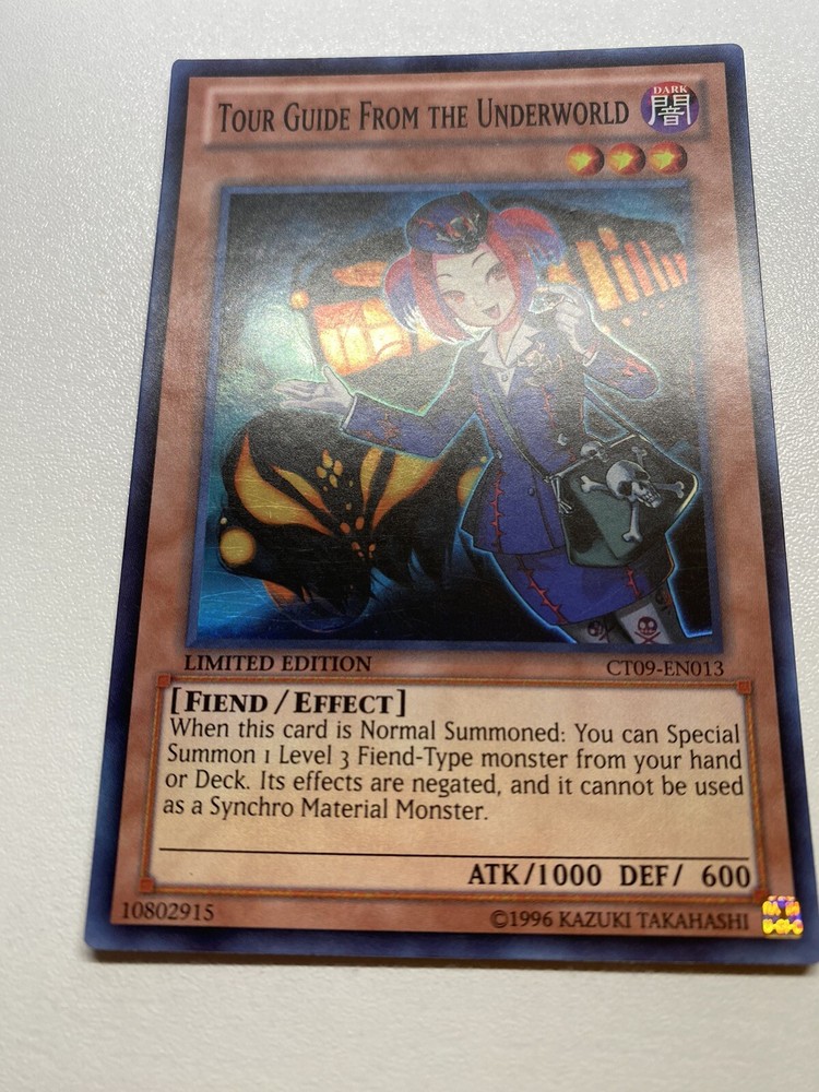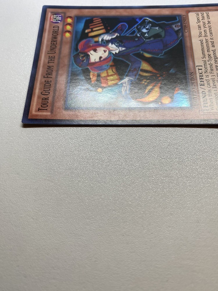 Yugioh Tour Guide From The Underworld Super Rare Limited Edition CT09-EN013 LP It is lightly played. Check pictures to see details on condition of the card. The front and back of the card are slightly dirty from gameplay. The front and the back are slightly scratched from gameplay. The four corners are slightly scratched up. “eBay International Shipping Program” and USA shipping only. No international shipping. I do combine/bundle shipping. I do use recycled shipping items to stay eco friendly for our beautiful earth. Please leave positive feedback, and I will return positive feedback for better customer satisfaction, thanks.