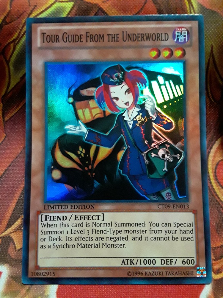 Tour Guide from the Underworld from CT09 Super Rare Limited Edition This card is in a lightly played condition. The card is sent in a card sleeve and a hard plastic top loader. If a large number of cards are purchased at once, the cards may be sent in a safe and secure container instead. If payment is not made within 72 hours of selecting a card(s), the item will no longer be entitled to you, unless you contact us asking for more time. We do not cancel orders because a card has changed in price. Shipping: Orders are shipped within two business days of a purchase being completed. Sorry, we do not provide tracking for orders under $20 Once an item is marked as shipped, the order has been dropped off at the post office. Please note that from there we cannot control how quickly the postal service operates. We do our best at being 100% honest and fair with the cards' conditions, any questions you may have, and the prices of the cards, so please be honest buyers. If you have any questions or concerns, please let us know, and we will be glad to assist. Check out the other cards we have listed! Thank you in advance, and happy dueling!