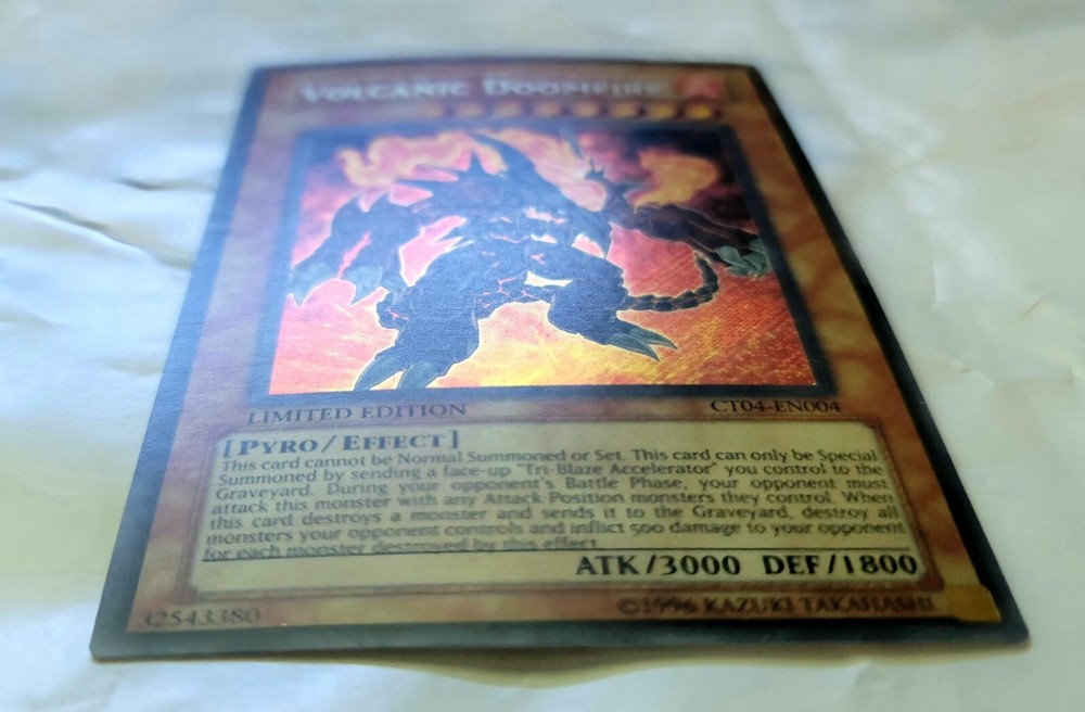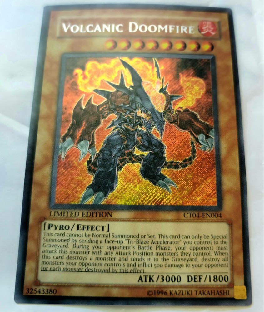 This limited edition Yugioh card features the Volcanic Doomfire effect, with a holographic finish and a card number of CT04-EN004. It is a secret rare card, with a rarity level that is not publicly known. The card is in English language and was manufactured by Konami in 2007. The card belongs to the Pyro creature/monster type, with a Fire attribute in the Yu-Gi-Oh! TCG game. It is part of the COLLECTORS TIN set and is an ideal addition to any CCG individual card collection.