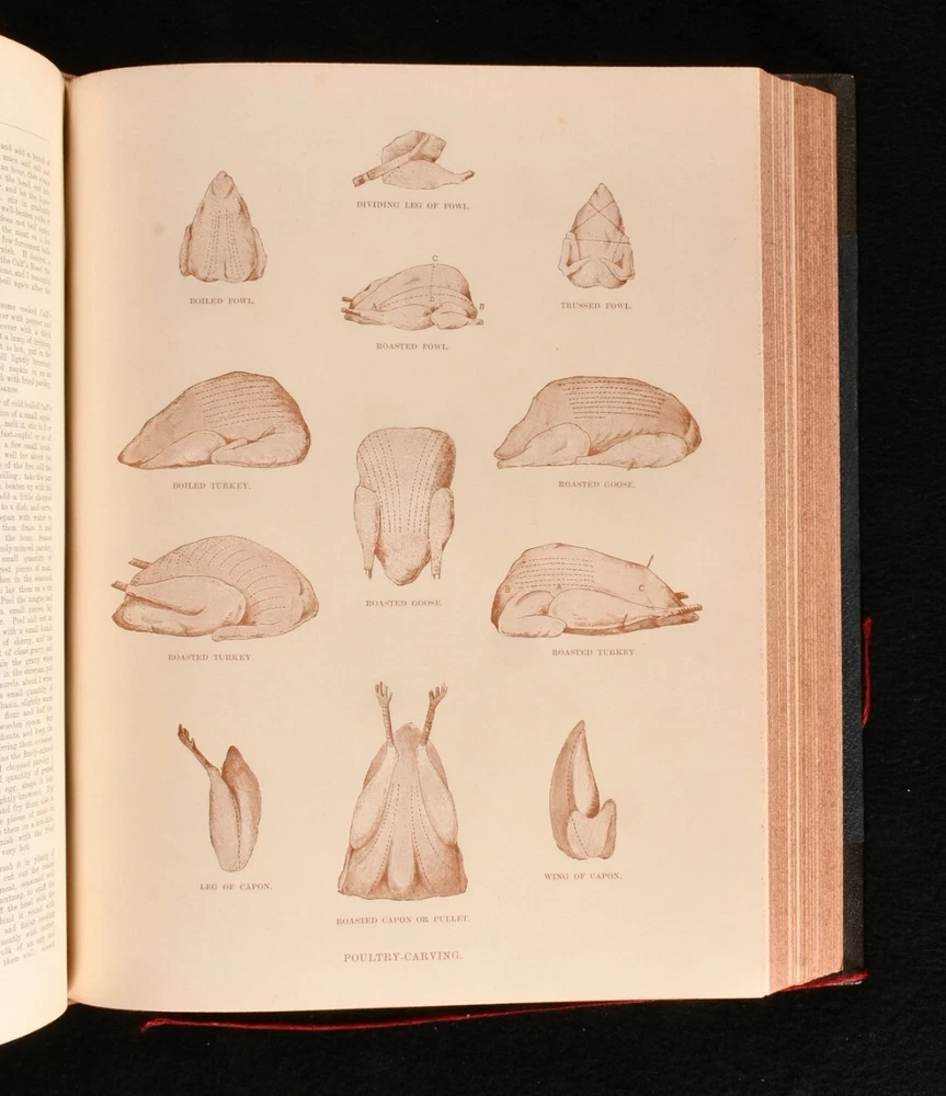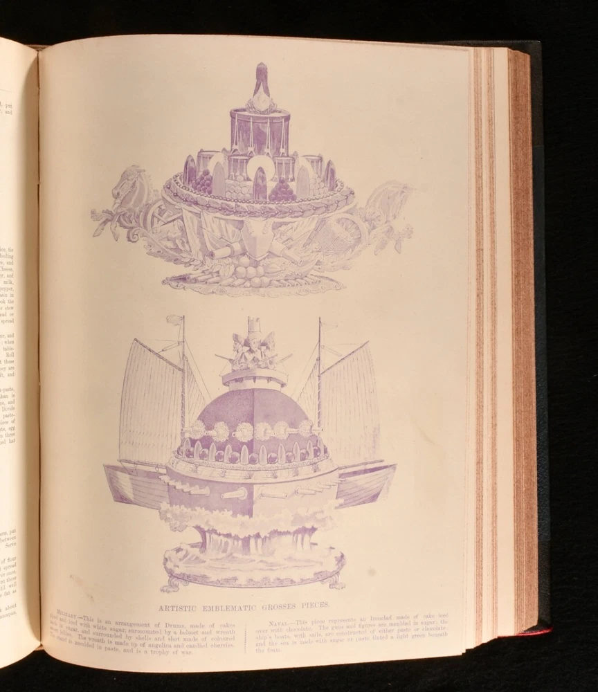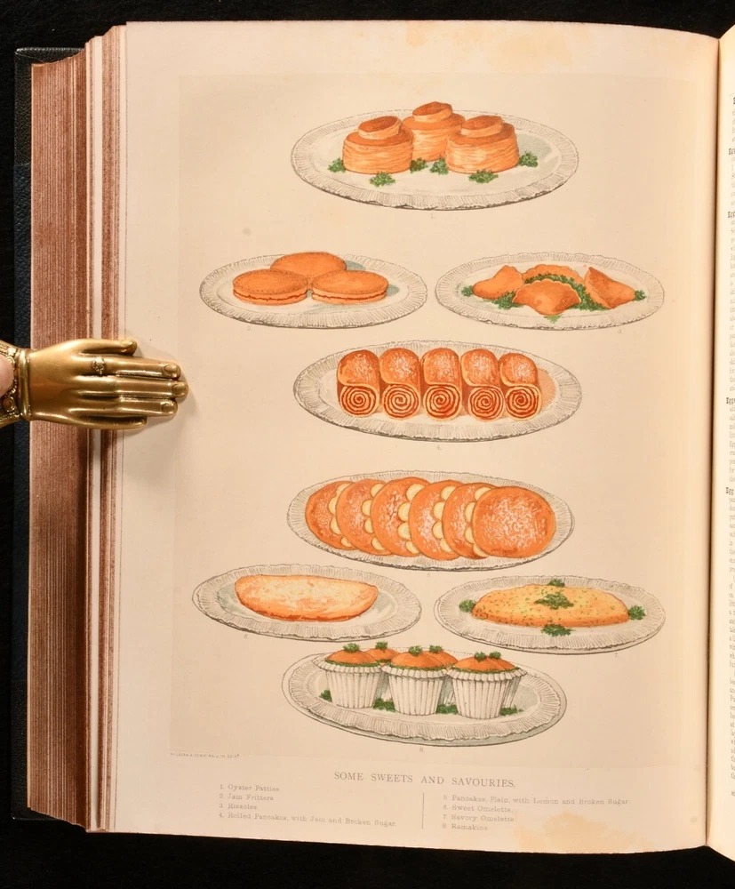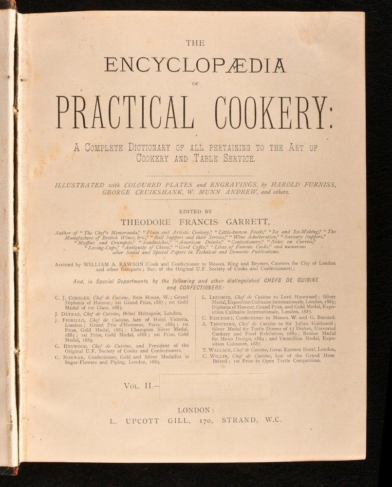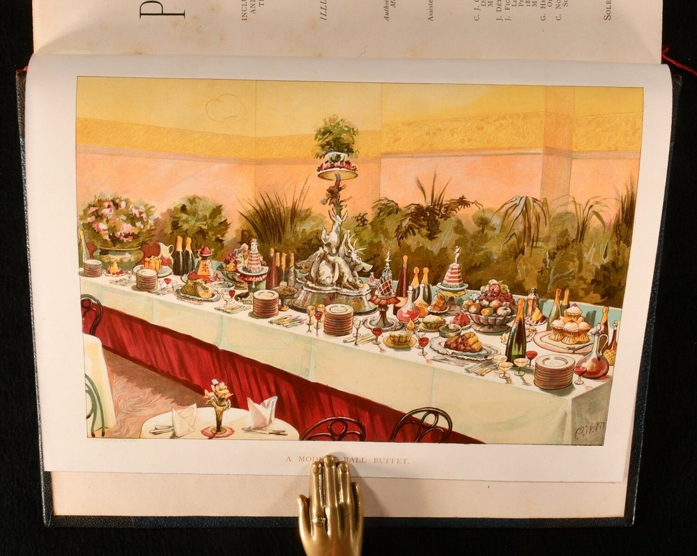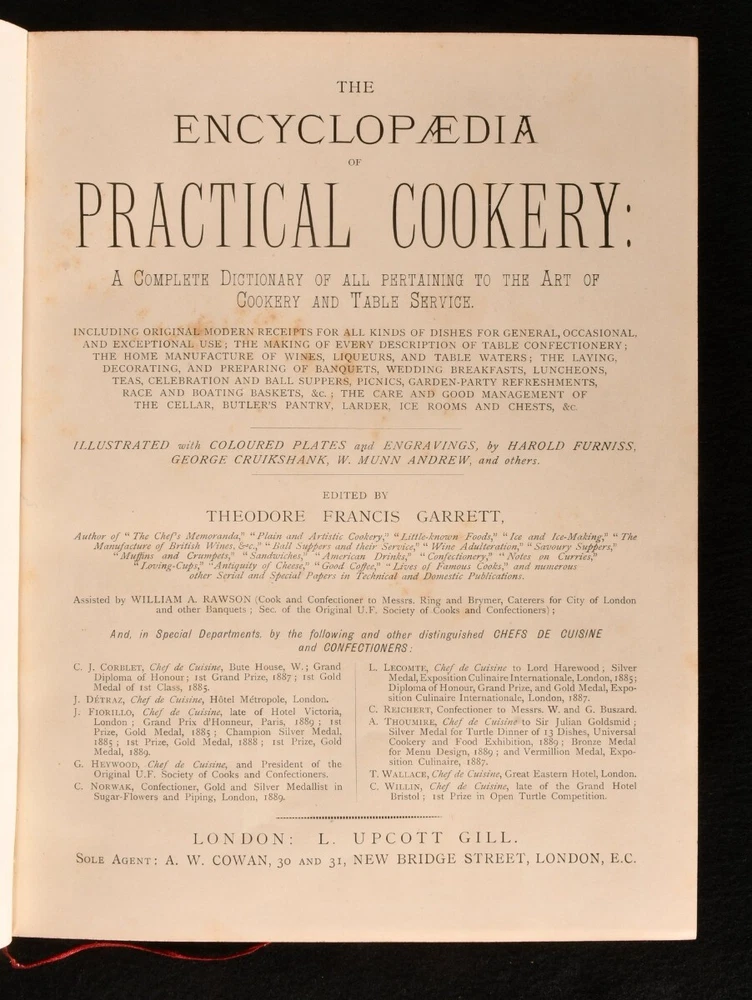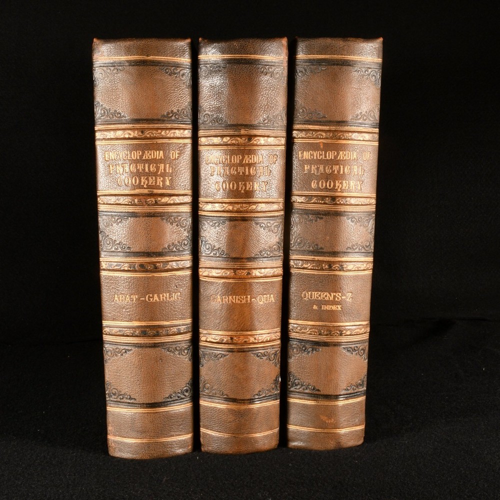 Click here to see our other books! The Encyclopaedia of Practical Cookery Theodore Francis Garrett c1890 Upcott Gill : London 11" by 8.5" [1] iv, 668; [4] 669-1006, [1]-280; [4] 281-892pp. SUMMARY A handsomely bound set of this practical encyclopaedia of cookery, beautifully illustrated with colour and folding demonstrative plates. Folding Plates,Illustrated,Leather Binding,Rebound Overall Condition: Very Good This book weighs 7 KG when packed UK Postage: £ 4.49 US Postage: £ 52.99 EU Postage : £ 30.99 European Postage: £ 55.99 Asia Postage: £ 89.99 Worldwide Postage: £ 189.99 DESCRIPTION Eight volumes bound across three, with continuous pagination from A-M and then N-Z as called for. Title page for volume three is bound in volume two, with amended half title bound at the beginning of volume three. Profusely illustrated throughout with sixty one colour plates, of sixty five, several of which folding. Lacking four plates, including frontispiece of the editor. Also contains vignette illustrations throughout. Illustrated by some of the most well-regarded illustrators of the period, including Harold Furniss, George Cruikshank and W. Munn Andrew. A charming and thorough work, this encyclopaedia covers a wide variety of cooking terminology and ingredients, including detailed recipes for simple and elaborate meals and special occasion foods. The work is credited for its precise phrasing and demonstrative illustrations, which are both useful and highly decorative. Edited by Theodore Francis Garrett. CONDITION In half morocco bindings with cloth covered boards. Externally in excellent condition with slight rubbing to the extremities. The odd mark to the board. Fading to the spines. Hinges slightly strained but firm. Internally firmly bound. Pages generally bright and clean with slight age toning and the odd spot, heavier to the first and last few pages. Evidence of professional repair to title page of volume two including tipping in of small area of paper to cover volume details, presumably done when rebound. Overall Condition: Very Good GLOSSARY OF TERMS Overall Condition (Dustwrapper condition rating is shown after that for the book itself, where a dustwrapper is present) Fine - Very well preserved copy showing very little wear Very Good Indeed - Only one or two minor faults, really a very attractive copy Very Good - Quite a wide term meaning no major faults but probably several smaller ones often expected given the age of the book, but still a respectable copy Good - Meaning not very good. Some more serious faults as will be described in the condition report under 'condition' Good Only - Meaning one or more faults that could really do with repair Fair - As with good only above but with other faults leaving a compromised copy even after repair Poor - Really bad and possibly seriously incomplete. We only sell books in this condition where their rarity or value makes them attractive none the less. Major defects will be described. GUARANTEE We offer a full money back guarantee on our descriptions. Please ask for details and conditions. We prefer PAYPAL. If you pay via PAYPAL we will post the item off the same or the next working day with the postage you have selected. Please note we cannot accept USD cheques