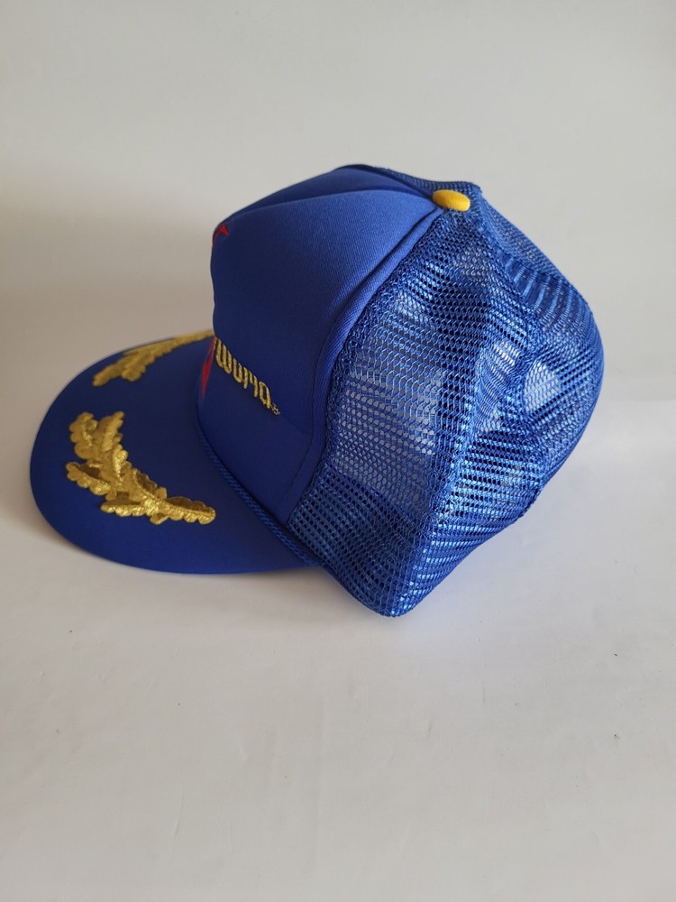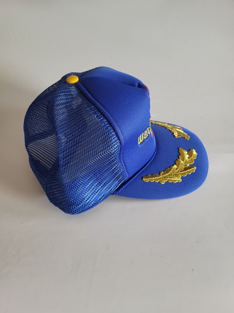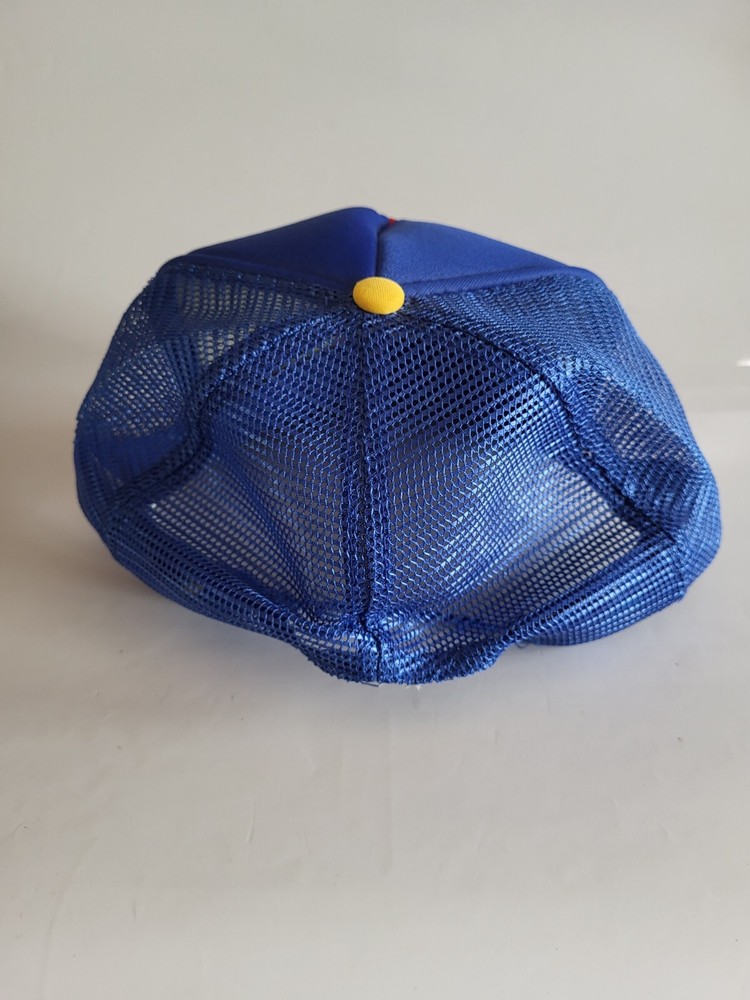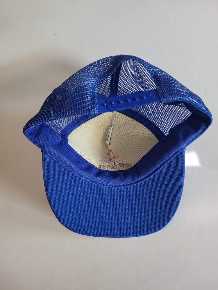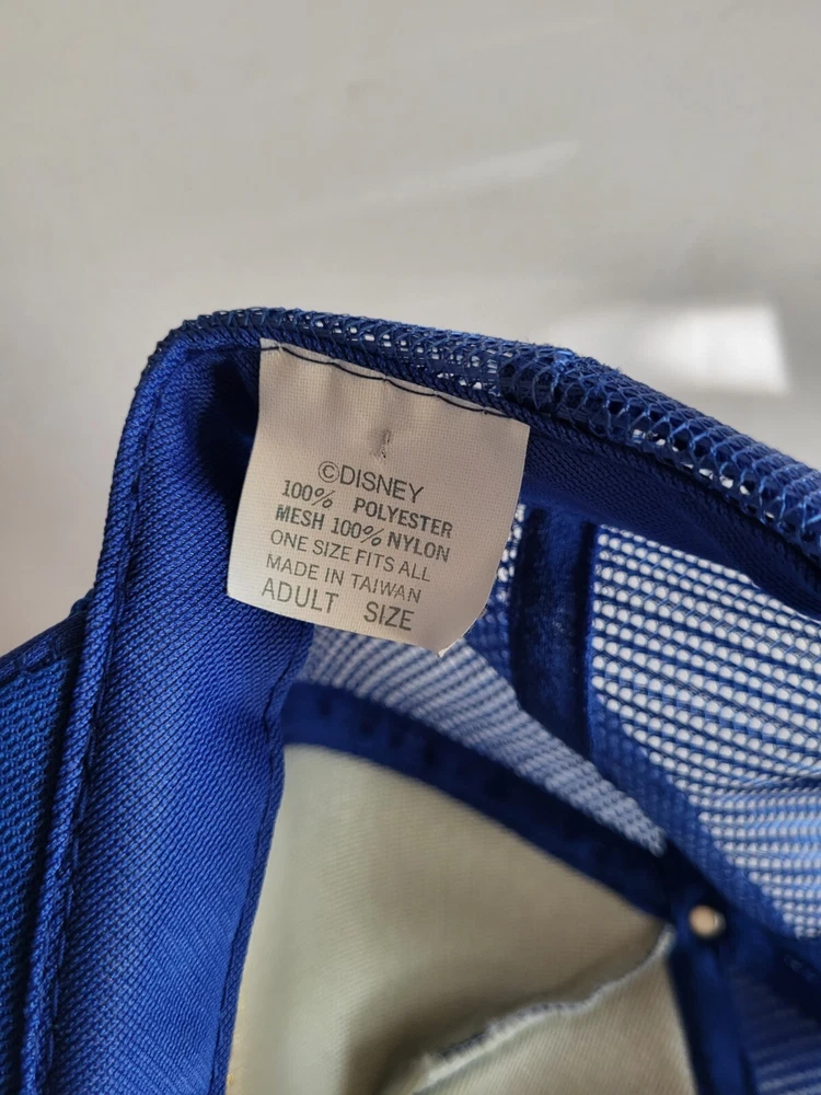 This vintage 80s Walt Disney World snapback hat is a must-have for any Disney fan. The blue trucker hat features a scrambled eggs design and is made of polyester material. The hat is adjustable, making it suitable for men of all sizes. The hat is perfect for anyone who loves 80s and 90s fashion and is a great addition to any hat collection. It is a vintage item, making it a unique and rare find. Grab this Disney hat today and add a touch of nostalgia to your outfit.