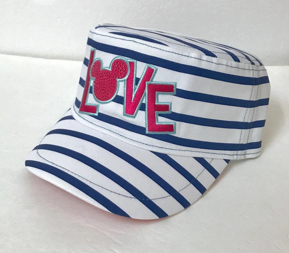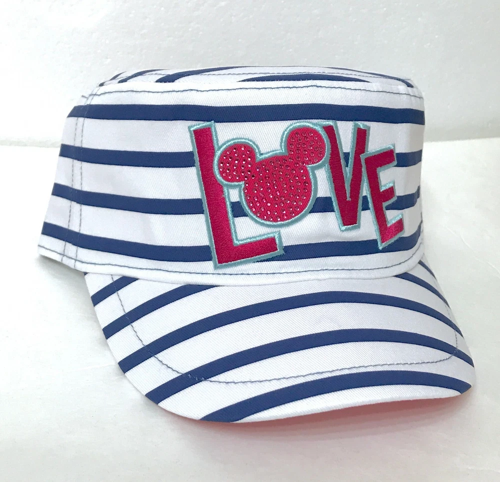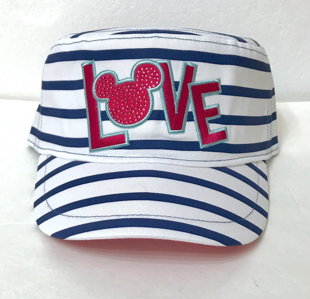 DETAILS: - Cute MICKEY MOUSE LOVE hat for women - Standard adult size , strap adjustable one size fits most women (should fit most teen girls too) - White and navy blue striped - Magenta logo on front, with sparkly rhinestones for bling! - Cadet/military style with shorter brim - Small patch logo on back - Official Disney Parks product - Retails for $24.99, cheaper here! CONDITION: NEW with tag inventory code #20904075DM12
