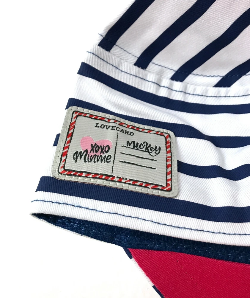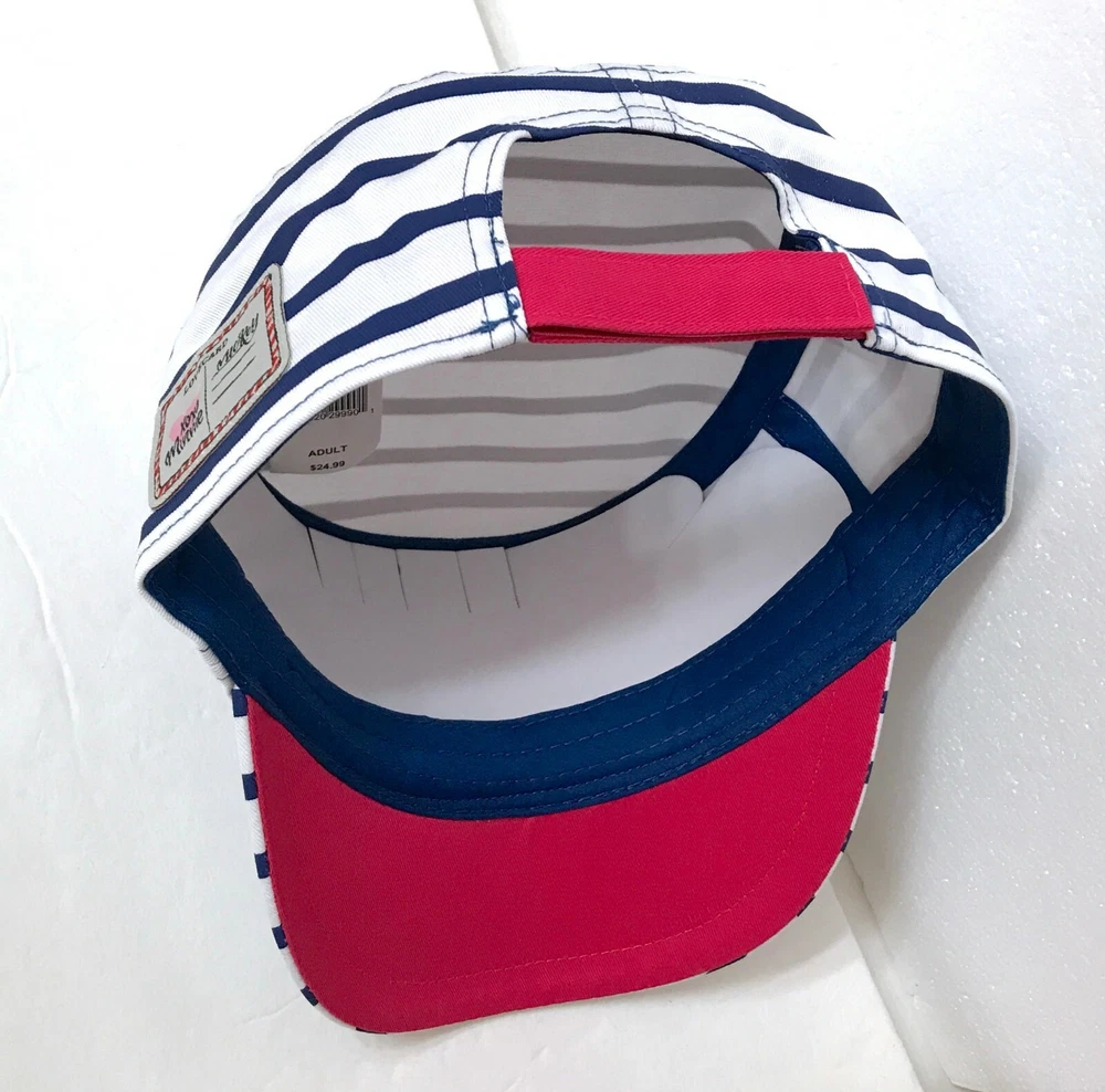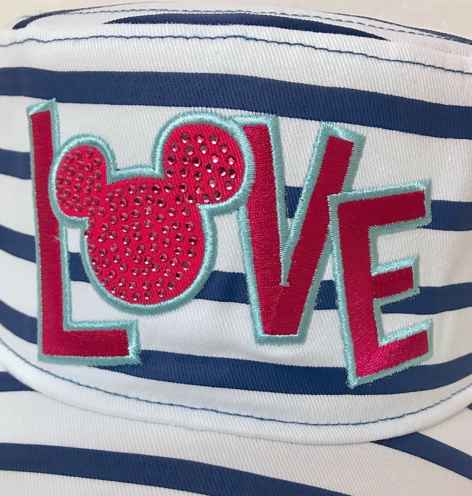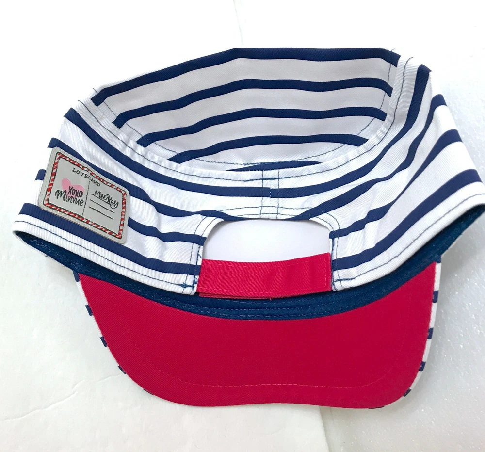 DETAILS: - Cute MICKEY MOUSE LOVE hat for women - Standard adult size , strap adjustable one size fits most women (should fit most teen girls too) - White and navy blue striped - Magenta logo on front, with sparkly rhinestones for bling! - Cadet/military style with shorter brim - Small patch logo on back - Official Disney Parks product - Retails for $24.99, cheaper here! CONDITION: NEW with tag inventory code #20904075DM12
